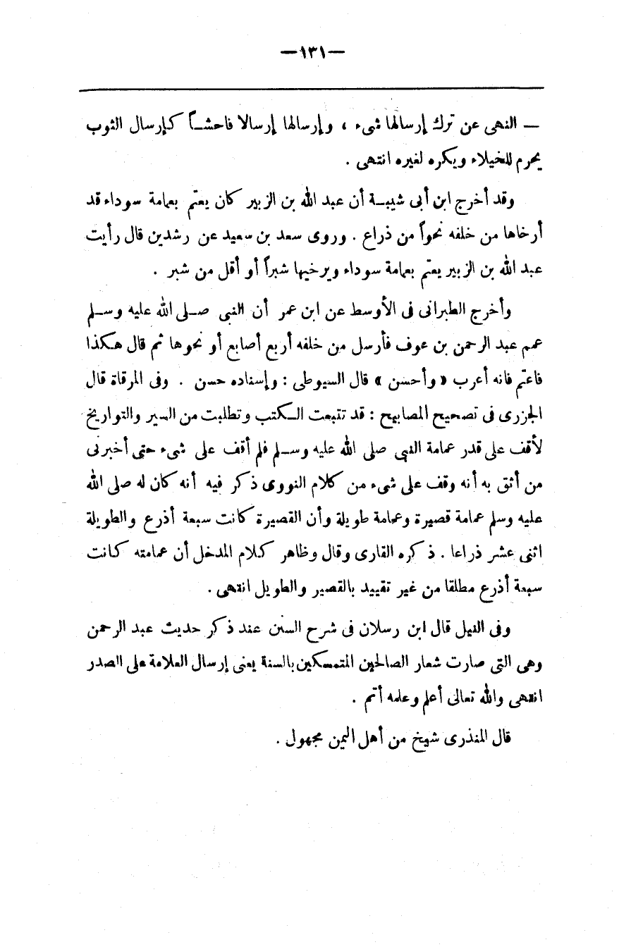 وَأَخْرَجَ الطَّبَرَانِيُّ فِي الْأَوْسَط عَنْ اِبْن عُمَر أَنَّ النَّبِيّ صَلَّى اللَّه عَلَيْهِ وَسَلَّمَ عَمَّمَ عَبْد الرَّحْمَن بْن عَوْف فَأَرْسَلَ مِنْ خَلْفه أَرْبَع أَصَابِع أَوْ نَحْوهَا ثُمَّ قَالَ هَكَذَا فَاعْتَمَّ فَإِنَّهُ أَعْرَب " وَأَحْسَن " قَالَ السُّيُوطِيّ : وَإِسْنَاده حَسَن . وَفِي الْمِرْقَاة قَالَ الْجَزَرِيُّ فِي تَصْحِيح الْمَصَابِيح : قَدْ تَتَبَّعْت الْكُتُب وَتَطَلَّبْت مِنْ السِّيَر وَالتَّوَارِيخ لِأَقِف عَلَى قَدْر عِمَامَة النَّبِيّ صَلَّى اللَّه عَلَيْهِ وَسَلَّمَ فَلَمْ أَقِف عَلَى شَيْء حَتَّى أَخْبَرَنِي مَنْ أَثِق بِهِ أَنَّهُ وَقَفَ عَلَى شَيْء مِنْ كَلَام النَّوَوِيّ ذَكَرَ فِيهِ أَنَّهُ كَانَ لَهُ صَلَّى اللَّه عَلَيْهِ وَسَلَّمَ عِمَامَة قَصِيرَة وَعِمَامَة طَوِيلَة وَأَنَّ الْقَصِيرَة كَانَتْ سَبْعَة أَذْرُع وَالطَّوِيلَة اِثْنَيْ عَشَر ذِرَاعًا . ذَكَرَهُ الْقَارِي وَقَالَ وَظَاهِر كَلَام الْمَدْخَل أَنَّ عِمَامَته كَانَتْ سَبْعَة أَذْرُع مُطْلَقًا مِنْ غَيْر تَقْيِيد بِالْقَصِيرِ وَالطَّوِيل اِنْتَهَى .