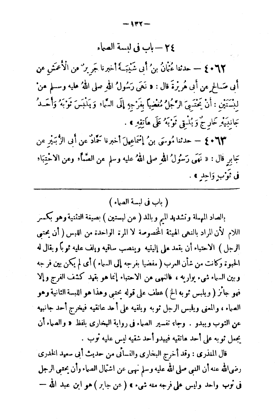 قَالَ الْمُنْذِرِيُّ : وَقَدْ أَخْرَجَ الْبُخَارِيّ وَالنَّسَائِيُّ مِنْ حَدِيث أَبِي سَعِيد الْخُدْرِيِّ رَضِيَ اللَّه عَنْهُ أَنَّ النَّبِيّ صَلَّى اللَّه عَلَيْهِ وَسَلَّمَ نَهَى عَنْ اِشْتِمَال الصَّمَّاء وَأَنْ يَحْتَبِي الرَّجُل فِي ثَوْب وَاحِد وَلَيْسَ عَلَى فَرْجه مِنْهُ شَيْء " .