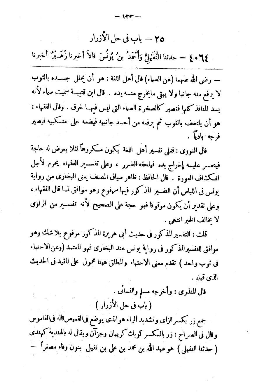 قَالَ النَّوَوِيّ : فَعَلَى تَفْسِير أَهْل اللُّغَة يَكُون مَكْرُوهًا لِئَلَّا يَعْرِض لَهُ حَاجَة فَيَتَعَسَّر عَلَيْهِ إِخْرَاج يَده فَيَلْحَقهُ الضَّرَر ، وَعَلَى تَفْسِير الْفُقَهَاء يَحْرُم لِأَجْلِ اِنْكِشَاف الْعَوْرَة . قَالَ الْحَافِظ : ظَاهِر سِيَاق الْمُصَنِّف يَعْنِي الْبُخَارِيّ مِنْ رِوَايَة يُونُس فِي اللِّبَاس أَنَّ التَّفْسِير الْمَذْكُور فِيهَا مَرْفُوع وَهُوَ مُوَافِق لِمَا قَالَ الْفُقَهَاء ، وَعَلَى تَقْدِير أَنْ يَكُون مَوْقُوفًا فَهُوَ حُجَّة عَلَى الصَّحِيح لِأَنَّهُ تَفْسِير مِنْ الرَّاوِي لَا يُخَالِف الْخَبَر اِنْتَهَى .