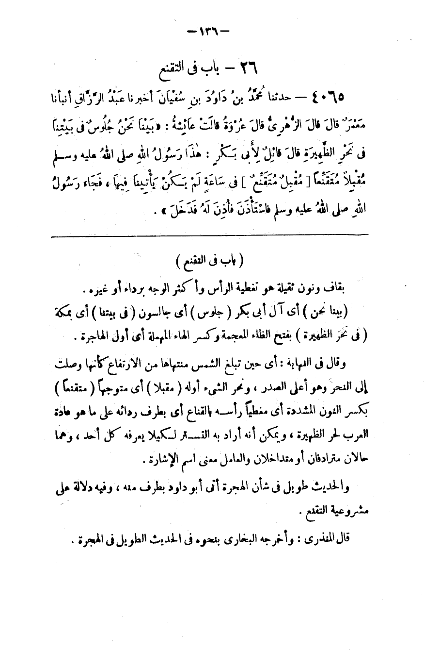 وَالْحَدِيث طَوِيل فِي شَأْن الْهِجْرَة أَتَى أَبُو دَاوُدَ بِطَرَفٍ مِنْهُ ، وَفِيهِ دَلَالَة عَلَى مَشْرُوعِيَّة التَّقَنُّع .