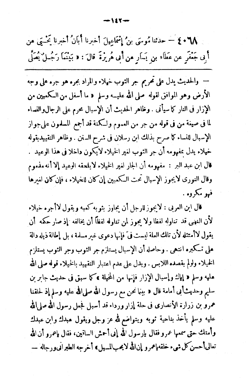 قَالَ اِبْن عَبْد الْبَرّ : مَفْهُومه أَنَّ الْجَارّ لِغَيْرِ الْخُيَلَاء لَا يَلْحَقهُ الْوَعِيد إِلَّا أَنَّهُ مَذْمُوم وَقَالَ النَّوَوِيّ لَا يَجُوز الْإِسْبَال تَحْت الْكَعْبَيْنِ إِنْ كَانَ لِلْخُيَلَاءِ ، فَإِنْ كَانَ لِغَيْرِهَا فَهُوَ مَكْرُوه .