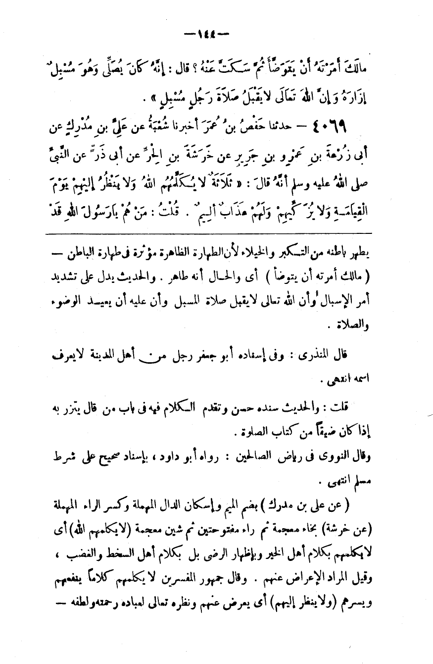 حَدِيث " لَا يَقْبَل اللَّه صَلَاة رَجُل مُسْبِل " ثُمَّ قَالَ : وَوَجْه هَذَا الْحَدِيث - وَاَللَّه أَعْلَم - أَنَّ إِسْبَال الْإِزَار مَعْصِيَة . وَكُلّ مَنْ وَاقَعَ مَعْصِيَة فَإِنَّهُ يُؤْمَر بِالْوُضُوءِ وَالصَّلَاة . فَإِنَّ الْوُضُوء يُطْفِئ حَرِيق الْمَعْصِيَة .