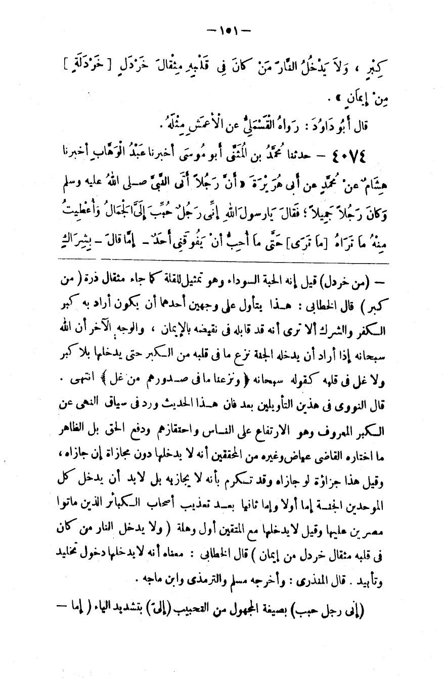 : قَالَ الْخَطَّابِيُّ : هَذَا يُتَأَوَّل عَلَى وَجْهَيْنِ أَحَدهمَا أَنْ يَكُون أَرَادَ بِهِ كِبْر الْكُفْر وَالشِّرْك أَلَا تَرَى أَنَّهُ قَدْ قَابَلَهُ فِي نَقِيضه بِالْإِيمَانِ ، وَالْوَجْه الْآخَر أَنَّ اللَّه سُبْحَانه إِذَا أَرَادَ أَنْ يُدْخِلهُ الْجَنَّة نَزَعَ مَا فِي قَلْبه مِنْ الْكِبْر حَتَّى يَدْخُلهَا بِلَا كِبْر وَلَا غِلّ فِي قَلْبه كَقَوْلِهِ سُبْحَانه { وَنَزَعْنَا مَا فِي صُدُورِهِمْ مِنْ غِلٍّ } اِنْتَهَى . قَالَ النَّوَوِيّ فِي هَذَيْنِ التَّأْوِيلَيْنِ بُعْد فَإِنَّ هَذَا الْحَدِيث وَرَدَ فِي سِيَاق النَّهْي عَنْ الْكِبْر الْمَعْرُوف وَهُوَ الِارْتِفَاع عَلَى النَّاس وَاحْتِقَارهمْ وَدَفْع الْحَقّ بَلْ الظَّاهِر مَا اِخْتَارَهُ الْقَاضِي عِيَاض ، وَغَيْره مِنْ الْمُحَقِّقِينَ أَنَّهُ لَا يَدْخُلهَا دُون مُجَازَاة إِنْ جَازَاهُ ، وَقِيلَ هَذَا جَزَاؤُهُ لَوْ جَازَاهُ وَقَدْ تَكَرَّمَ بِأَنَّهُ لَا يُجَازِيه بَلْ لَا بُدّ أَنْ يَدْخُل كُلّ الْمُوَحِّدِينَ الْجَنَّة إِمَّا أَوَّلًا وَإِمَّا ثَانِيًا بَعْد تَعْذِيب أَصْحَاب الْكَبَائِر الَّذِينَ مَاتُوا مُصِرِّينَ عَلَيْهَا وَقِيلَ لَا يَدْخُلهَا مَعَ الْمُتَّقِينَ أَوَّل وَهْلَة ( وَلَا يَدْخُل النَّار مَنْ كَانَ فِي قَلْبه مِثْقَال خَرْدَل مِنْ إِيمَان ) : قَالَ الْخَطَّابِيُّ : مَعْنَاهُ أَنَّهُ لَا يَدْخُلهَا دُخُول تَخْلِيد وَتَأْبِيد . قَالَ الْمُنْذِرِيُّ : وَأَخْرَجَهُ مُسْلِم وَالتِّرْمِذِيّ وَابْن مَاجَهْ .