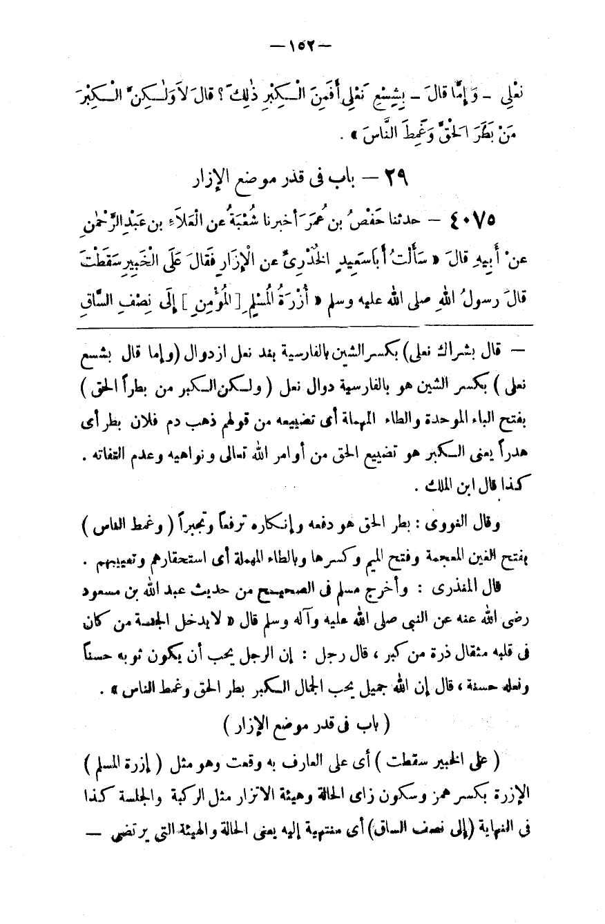 قَالَ الْمُنْذِرِيُّ : وَأَخْرَجَ مُسْلِم فِي الصَّحِيح مِنْ حَدِيث عَبْد اللَّه بْن مَسْعُود رَضِيَ اللَّه عَنْهُ عَنْ النَّبِيّ صَلَّى اللَّه عَلَيْهِ وَسَلَّمَ قَالَ " لَا يَدْخُل الْجَنَّة مَنْ كَانَ فِي قَلْبه مِثْقَال ذَرَّة مِنْ كِبْر ، قَالَ رَجُل : إِنَّ الرَّجُل يُحِبّ أَنْ يَكُون ثَوْبه حَسَنًا وَنَعْله حَسَنَة ، قَالَ إِنَّ اللَّه جَمِيل يُحِبّ الْجَمَال الْكِبْر بَطَر الْحَقّ وَغَمْط النَّاس " .