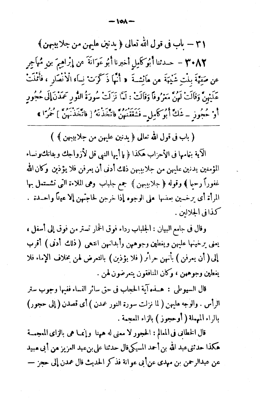 قَالَ السُّيُوطِيُّ : هَذِهِ آيَة الْحِجَاب فِي حَقّ سَائِر النِّسَاء فَفِيهَا وُجُوب سَتْر الرَّأْس .