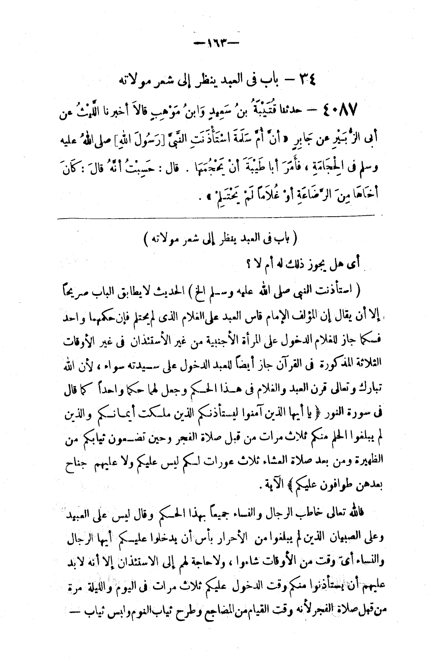 فَاَللَّه تَعَالَى خَاطَبَ الرِّجَال وَالنِّسَاء جَمِيعًا بِهَذَا الْحُكْم وَقَالَ لَيْسَ عَلَى الْعَبِيد وَعَلَى الصِّبْيَان الَّذِينَ لَمْ يَبْلُغُوا مِنْ الْأَحْرَار بَأْس أَنْ يَدْخُلُوا عَلَيْكُمْ أَيّهَا الرِّجَال وَالنِّسَاء أَيّ وَقْت مِنْ الْأَوْقَات شَاءُوا ، وَلَا حَاجَة لَهُمْ إِلَى الِاسْتِئْذَان إِلَّا أَنَّهُ لَا بُدّ عَلَيْهِمْ أَنْ يَسْتَأْذِنُوا مِنْكُمْ وَقْت الدُّخُول عَلَيْكُمْ ثَلَاث مَرَّات فِي الْيَوْم وَاللَّيْلَة مَرَّة مِنْ قَبْل صَلَاة الْفَجْر لِأَنَّهُ وَقْت الْقِيَام مِنْ الْمَضَاجِع وَطَرْح ثِيَاب النَّوْم وَلُبْس ثِيَاب@