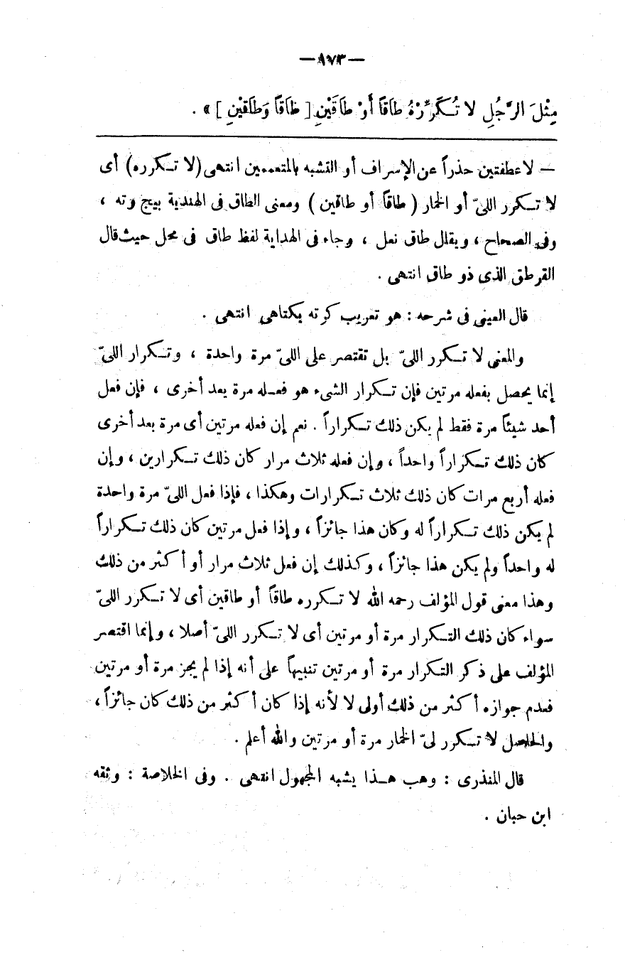 وَالْمَعْنَى لَا تُكَرِّر اللَّيّ بَلْ تَقْتَصِر عَلَى اللَّيّ مَرَّة وَاحِدَة ، تَكْرَار اللَّيّ إِنَّمَا يَحْصُل بِفِعْلِهِ مَرَّتَيْنِ فَإِنَّ تَكْرَار الشَّيْء هُوَ فِعْله مَرَّة بَعْد أُخْرَى ، فَإِنْ فَعَلَ أَحَد شَيْئًا مَرَّة فَقَطْ لَمْ يَكُنْ ذَلِكَ تَكْرَارًا . نَعَمْ إِنْ فَعَلَهُ مَرَّتَيْنِ أَيْ مَرَّة بَعْد أُخْرَى كَانَ ذَلِكَ تَكْرَارًا وَاحِدًا ، وَإِنْ فَعَلَهُ ثَلَاث مِرَار كَانَ ذَلِكَ تَكْرَارَيْنِ ، وَإِنْ فَعَلَهُ أَرْبَع مَرَّات كَانَ ذَلِكَ ثَلَاث تَكْرَارَات وَهَكَذَا ، فَإِذَا فَعَلَ اللَّيّ مَرَّة وَاحِدَة لَمْ يَكُنْ ذَلِكَ تَكْرَارًا لَهُ وَكَانَ هَذَا جَائِزًا ، وَإِذَا فَعَلَ مَرَّتَيْنِ كَانَ ذَلِكَ تَكْرَارًا لَهُ وَاحِدًا وَلَمْ يَكُنْ هَذَا جَائِز ، وَكَذَلِكَ إِنْ فَعَلَ ثَلَاث مِرَار أَوْ أَكْثَر مِنْ ذَلِكَ وَهَذَا مَعْنَى قَوْل الْمُؤَلِّف رَحِمَهُ اللَّه لَا تُكَرِّرهُ طَاقًا أَوْ طَاقَيْنِ أَيْ لَا تُكَرِّر اللَّيّ سَوَاء كَانَ ذَلِكَ التَّكْرَار مَرَّة أَوْ مَرَّتَيْنِ أَيْ لَا تُكَرِّر اللَّيّ أَصْلًا ، وَإِنَّمَا اِقْتَصَرَ الْمُؤَلِّف عَلَى ذِكْر التَّكْرَار مَرَّة أَوْ مَرَّتَيْنِ تَنْبِيهًا عَلَى أَنَّهُ إِذَا لَمْ يَجُزْ مَرَّة أَوْ مَرَّتَيْنِ فَعَدَم جَوَازه أَكْثَر مِنْ ذَلِكَ أَوْلَى لَا لِأَنَّهُ إِذَا كَانَ أَكْثَر مِنْ ذَلِكَ كَانَ جَائِزًا ، وَالْحَاصِل لَا تُكَرِّر لَيّ الْخِمَار مَرَّة أَوْ مَرَّتَيْنِ وَاَللَّه أَعْلَم .