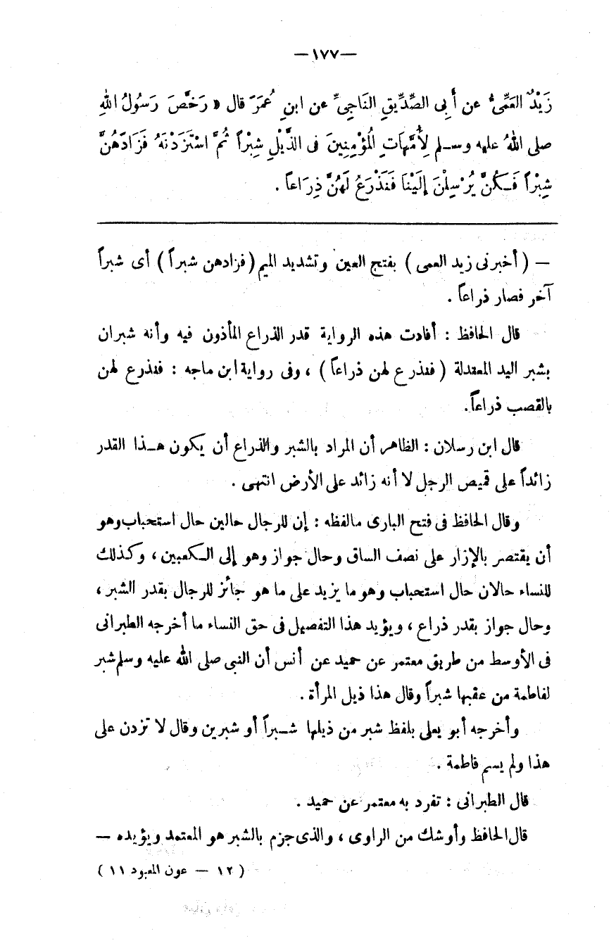 وَقَالَ الْحَافِظ فِي فَتْح الْبَارِي مَا لَفْظه : إِنَّ لِلرِّجَالِ حَالَيْنِ حَال اِسْتِحْبَاب وَهُوَ أَنْ يَقْتَصِر بِالْإِزَارِ عَلَى نِصْف السَّاق وَحَال جَوَاز وَهُوَ إِلَى الْكَعْبَيْنِ ، وَكَذَلِكَ لِلنِّسَاءِ حَالَانِ حَال اِسْتِحْبَاب وَهُوَ مَا يَزِيد عَلَى مَا هُوَ جَائِز لِلرِّجَالِ بِقَدْرِ الشِّبْر ، وَحَال جَوَاز بِقَدْرِ ذِرَاع ، وَيُؤَيِّد هَذَا التَّفْصِيل فِي حَقّ النِّسَاء مَا أَخْرَجَهُ الطَّبَرَانِيُّ فِي الْأَوْسَط مِنْ طَرِيق مُعْتَمِر عَنْ حُمَيْدٍ عَنْ أَنَس أَنَّ النَّبِيّ صَلَّى اللَّه عَلَيْهِ وَسَلَّمَ شَبَّرَ لِفَاطِمَة مِنْ عَقِبهَا شِبْرًا وَقَالَ هَذَا ذَيْل الْمَرْأَة .