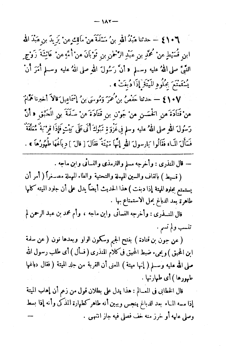 قَالَ الْخَطَّابِيُّ فِي الْمَعَالِم : هَذَا يَدُلّ عَلَى بُطْلَان قَوْل مَنْ زَعَمَ أَنَّ إِهَاب الْمَيْتَة إِذَا مَسَّهُ الْمَاء بَعْد الدِّبَاغ يَنْجُس وَيُبَيِّن أَنَّهُ طَاهِر كَطَهَارَةِ الْمُذَكَّى وَأَنَّهُ إِذَا بُسِطَ وَصُلِّيَ عَلَيْهِ ، أَوْ خُرِزَ مِنْهُ خُفٌّ فَصُلِّيَ فِيهِ جَازَ ، اِنْتَهَى .@