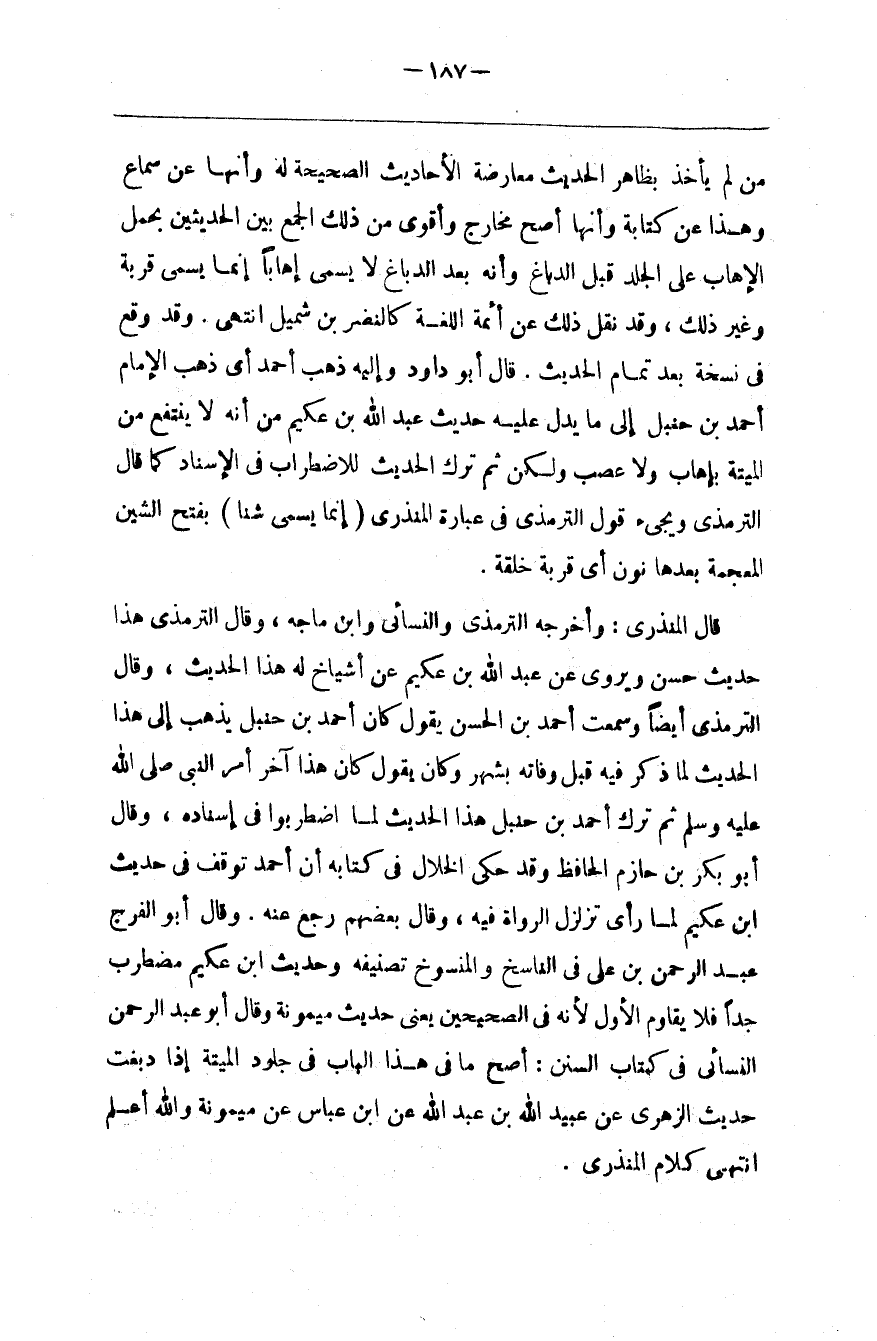 قَالَ الْمُنْذِرِيُّ . وَأَخْرَجَهُ التِّرْمِذِيّ وَالنَّسَائِيُّ وَابْن مَاجَهْ ، وَقَالَ التِّرْمِذِيّ هَذَا حَدِيث حَسَن وَيُرْوَى عَنْ عَبْد اللَّه بْن عُكَيْم عَنْ أَشْيَاخ لَهُ هَذَا الْحَدِيث ، وَقَالَ التِّرْمِذِيّ أَيْضًا وَسَمِعْت أَحْمَد بْن الْحَسَن يَقُول كَانَ أَحْمَد بْن حَنْبَل يَذْهَب إِلَى هَذَا الْحَدِيث لِمَا ذُكِرَ فِيهِ قَبْل وَفَاته بِشَهْرٍ وَكَانَ يَقُول كَانَ هَذَا آخِر أَمْر النَّبِيّ صَلَّى اللَّه عَلَيْهِ وَسَلَّمَ ثُمَّ تَرَكَ أَحْمَد بْن حَنْبَل هَذَا الْحَدِيث لَمَّا اِضْطَرَبُوا فِي إِسْنَاده ، وَقَالَ أَبُو بَكْر بْن حَازِم الْحَافِظ وَقَدْ حَكَى الْخَلَّال فِي كِتَابه أَنَّ أَحْمَد تَوَقَّفَ فِي حَدِيث ابْن عُكَيْم لَمَّا رَأَى تَزَلْزُل الرُّوَاة فِيهِ ، وَقَالَ بَعْضهمْ رَجَعَ عَنْهُ . وَقَالَ أَبُو الْفَرَج عَبْد الرَّحْمَن بْن عَلِيّ فِي النَّاسِخ وَالْمَنْسُوخ تَصْنِيفه وَحَدِيث اِبْن عُكَيْم مُضْطَرِب جِدًّا فَلَا يُقَاوِم الْأَوَّل لِأَنَّهُ فِي الصَّحِيحَيْنِ يَعْنِي حَدِيث مَيْمُونَة وَقَالَ عَبْد الرَّحْمَن النَّسَائِيُّ فِي كِتَاب السُّنَن : أَصَحّ مَا فِي هَذَا الْبَاب فِي جُلُود الْمَيْتَة إِذَا دُبِغَتْ حَدِيث الزُّهْرِيّ عَنْ عُبَيْد اللَّه بْن عَبْد اللَّه عَنْ اِبْن عَبَّاس عَنْ مَيْمُونَة وَاَللَّه أَعْلَم اِنْتَهَى كَلَام الْمُنْذِرِيِّ .@