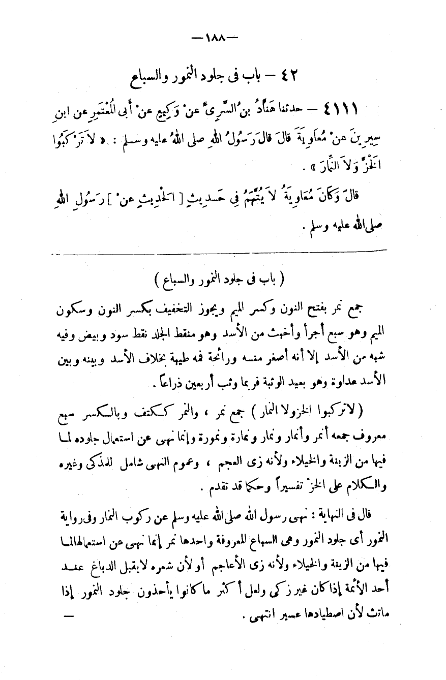 قَالَ فِي النِّهَايَة : نَهَى رَسُول اللَّه صَلَّى اللَّه عَلَيْهِ وَسَلَّمَ عَنْ رُكُوب النِّمَار وَفِي رِوَايَة النُّمُور أَيْ جُلُود النُّمُور وَهِيَ السِّبَاع الْمَعْرُوفَة وَاحِدهَا نَمِر إِنَّمَا نَهَى عَنْ اِسْتِعْمَالهَا لِمَا فِيهَا مِنْ الزِّينَة وَالْخُيَلَاء وَلِأَنَّهُ زِيّ الْأَعَاجِم أَوْ لِأَنَّ شَعْره لَا يَقْبَل الدِّبَاغ عِنْد أَحَد الْأَئِمَّة إِذَا كَانَ غَيْر ذَكِيّ وَلَعَلَّ أَكْثَر مَا كَانُوا يَأْخُذُونَ جُلُود النُّمُور إِذَا مَاتَتْ لِأَنَّ اِصْطِيَادهَا عَسِير اِنْتَهَى .@