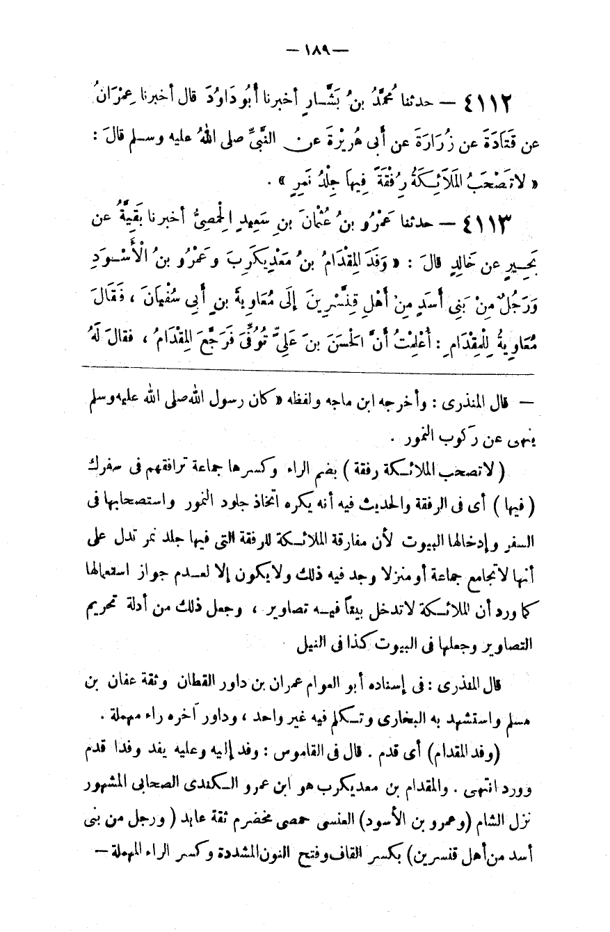: أَيْ فِي الرُّفْقَة وَالْحَدِيث فِيهِ يُكْرَه اِتِّخَاذ جُلُود النُّمُور وَاسْتِصْحَابهَا فِي السَّفَر وَإِدْخَالهَا الْبُيُوت لِأَنَّ مُفَارَقَة الْمَلَائِكَة لِلرُّفْقَةِ الَّتِي فِيهَا جِلْد نَمِر تَدُلّ عَلَى أَنَّهَا لَا تُجَامِع جَمَاعَة أَوْ مَنْزِلًا وُجِدَ فِيهِ ذَلِكَ وَلَا يَكُون إِلَّا لِعَدَمِ جِوَار اِسْتِعْمَالهَا كَمَا وَرَدَ أَنَّ الْمَلَائِكَة لَا تَدْخُل بَيْتًا فِيهِ تَصَاوِير ، وَجُعِلَ ذَلِكَ مِنْ أَدِلَّة تَحْرِيم التَّصَاوِير وَجَعْلهَا فِي الْبُيُوت كَذَا فِي النَّيْل .