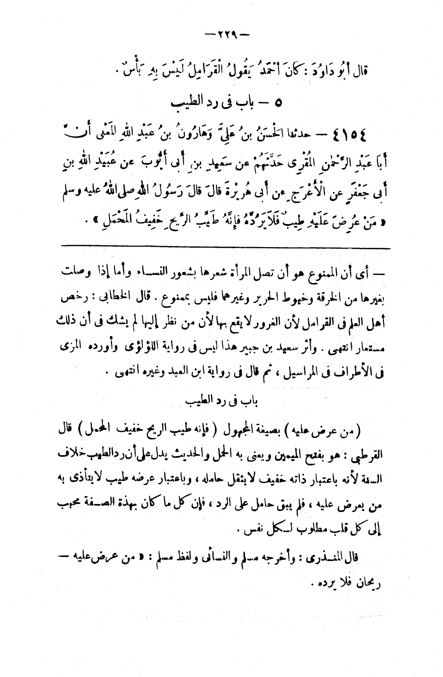 قَالَ الْمُنْذِرِيُّ : وَأَخْرَجَهُ مُسْلِم وَالنَّسَائِيُّ وَلَفْظ مُسْلِم : " مَنْ عُرِضَ عَلَيْهِ رَيْحَان فَلَا يَرُدّهُ .@