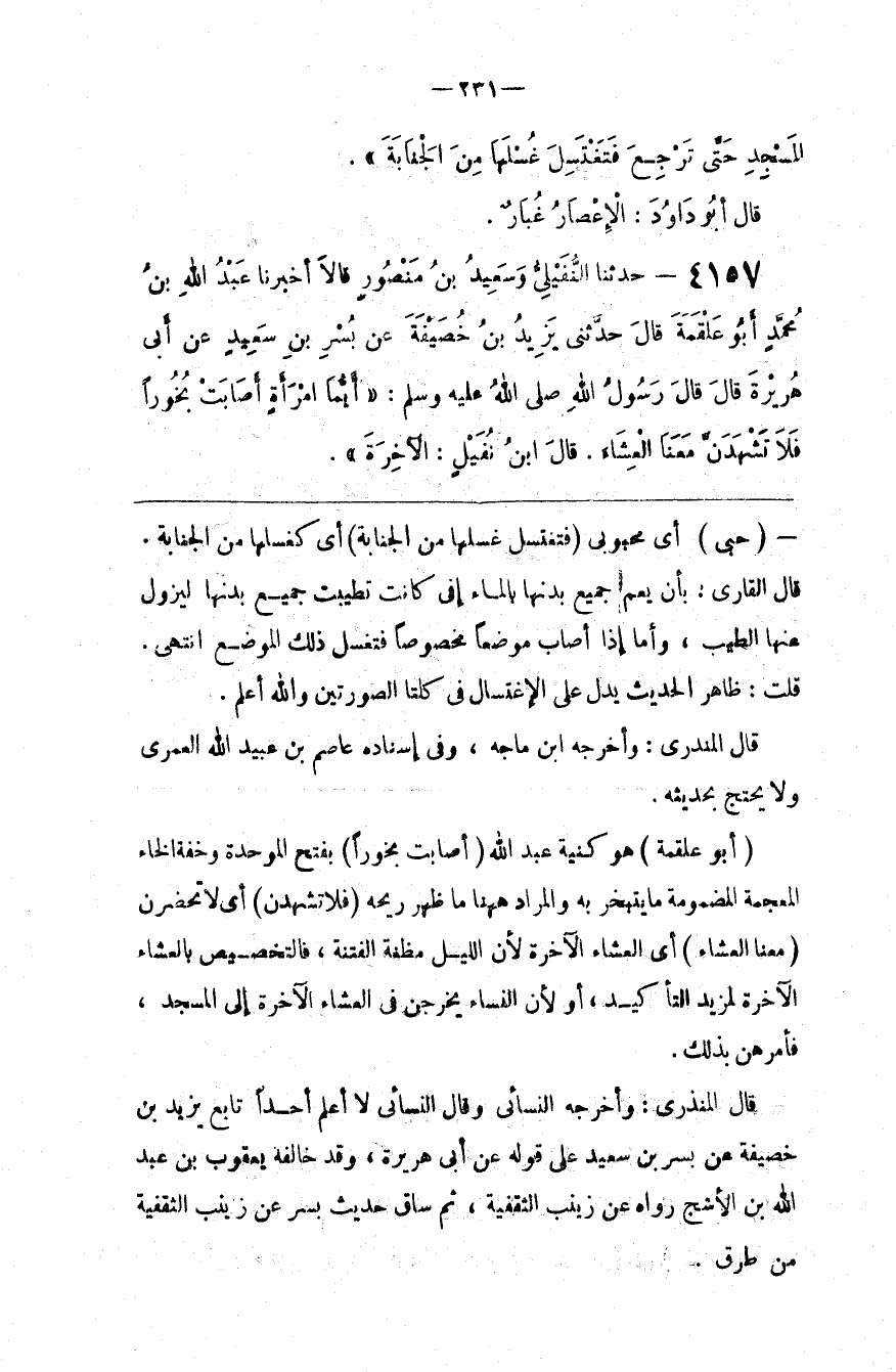 قَالَ الْمُنْذِرِيُّ : وَأَخْرَجَهُ النَّسَائِيُّ وَقَالَ النَّسَائِيُّ لَا أَعْلَم أَحَدًا تَابَعَ يَزِيد بْن خُصَيْفَة عَنْ بُسْر بْن سَعِيد عَلَى قَوْله عَنْ أَبِي هُرَيْرَة ، وَقَدْ خَالَفَهُ يَعْقُوب بْن عَبْد اللَّه بْن الْأَشَجّ رَوَاهُ عَنْ زَيْنَب الثَّقَفِيَّة ، ثُمَّ سَاقَ حَدِيث بُسْر عَنْ زَيْنَب الثَّقَفِيَّة مِنْ طُرُق .@