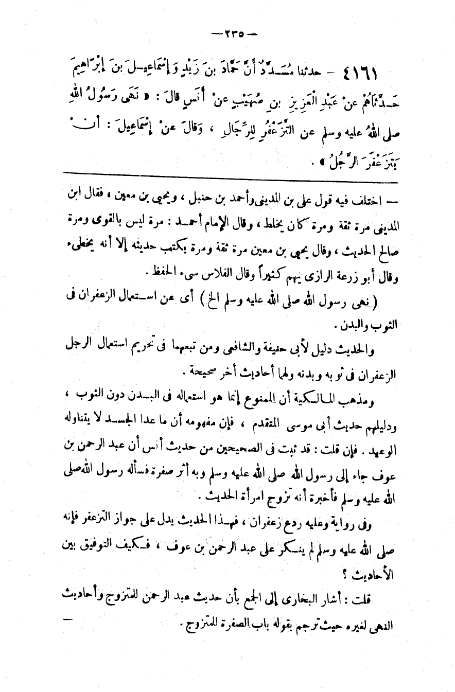 وَالْحَدِيث دَلِيل لِأَبِي حَنِيفَة وَالشَّافِعِيّ وَمَنْ تَبِعَهُمَا فِي تَحْرِيم اِسْتِعْمَال الرَّجُل الزَّعْفَرَان فِي ثَوْبه وَبَدَنه وَلَهُمَا أَحَادِيث أُخَر صَحِيحَة .
