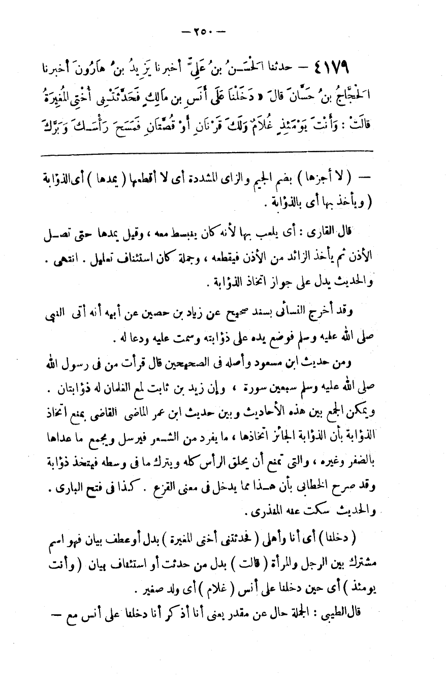 وَمِنْ حَدِيث اِبْن مَسْعُود وَأَصْله فِي الصَّحِيحَيْنِ قَالَ قَرَأْت مِنْ فِي رَسُول اللَّه صَلَّى اللَّه عَلَيْهِ وَسَلَّمَ سَبْعِينَ سُورَة ، وَإِنَّ زَيْد بْن ثَابِت لَمَعَ الْغِلْمَان لَهُ ذُؤَابَتَانِ . وَيُمْكِن الْجَمْع بَيْن هَذِهِ الْأَحَادِيث وَبَيْن حَدِيث اِبْن عُمَر الْمَاضِي الْقَاضِي بِمَنْعِ اِتِّخَاذ الذُّؤَابَة بِأَنَّ الذُّؤَابَة الْجَائِز اِتِّخَاذهَا ، مَا يُفْرَد مِنْ الشَّعْر فَيُرْسَل وَيُجْمَع مَا عَدَاهَا بِالضَّفْرِ وَغَيْره ، وَاَلَّتِي تُمْنَع أَنْ يُحْلَق الرَّأْس كُلّه وَيُتْرَك مَا فِي وَسَطه فَيُتَّخَذ ذُؤَابَة وَقَدْ صَرَّحَ الْخَطَّابِيُّ بِأَنَّ هَذَا مِمَّا يَدْخُل فِي مَعْنَى الْقَزَع . كَذَا فِي فَتْح الْبَارِي . وَالْحَدِيث سَكَتَ عَنْهُ الْمُنْذِرِيُّ .