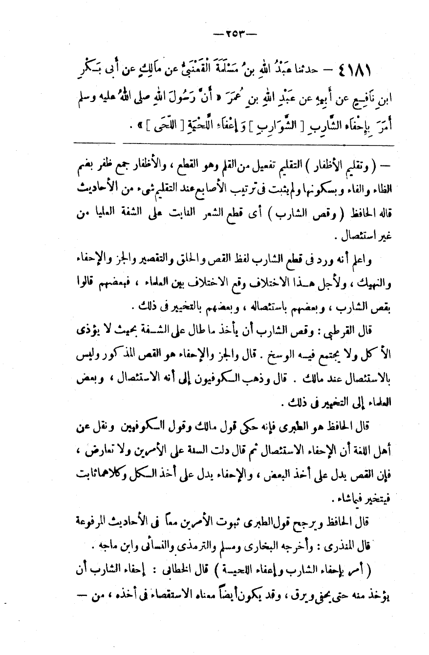 وَاعْلَمْ أَنَّهُ وَرَدَ فِي قَطْع الشَّارِب لَفْظ الْقَصّ وَالْحَلْق وَالتَّقْصِير وَالْجَزّ وَالْإِحْفَاء وَالنَّهِيك ، وَلِأَجْلِ هَذَا الِاخْتِلَاف وَقَعَ الِاخْتِلَاف بَيْن الْعُلَمَاء ، فَبَعْضهمْ قَالُوا بِقَصِّ الشَّارِب ، وَبَعْضهمْ بِاسْتِئْصَالِهِ ، وَبَعْضهمْ بِالتَّخْيِيرِ فِي ذَلِكَ .