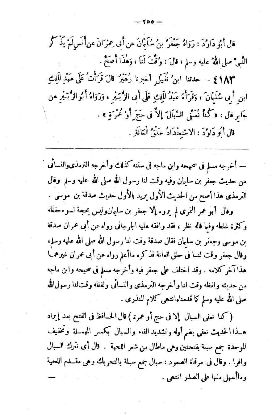 وَقَالَ أَبُو عُمَر النَّمِرِيّ لَمْ يَرْوِهِ إِلَّا جَعْفَر بْن سُلَيْمَان وَلَيْسَ بِحُجَّةٍ لِسُوءِ حِفْظه وَكَثْرَة غَلَطه وَفِيمَا قَالَهُ نَظَر ، فَقَدْ وَافَقَهُ عَلَيْهِ الْجُرْجَانِيُّ رَوَاهُ عَنْ أَبِي عِمْرَان صَدَقَة بْن مُوسَى وَجَعْفَر بْن سُلَيْمَان فَقَالَ صَدَقَة وَقَّتَ لَنَا رَسُول اللَّه صَلَّى اللَّه عَلَيْهِ وَسَلَّمَ ، وَقَالَ جَعْفَر لَنَا فِي حَلْق الْعَانَة فَذَكَرَهُ مَا أَعْلَم رَوَاهُ عَنْ أَبِي عِمْرَان غَيْرهمَا هَذَا آخِر كَلَامه . وَقَدْ اُخْتُلِفَ عَلَى جَعْفَر فِيهِ وَأَخْرَجَهُ مُسْلِم فِي صَحِيحه وَابْن مَاجَهْ مِنْ حَدِيثه وَلَفْظه وُقِّتَ لَنَا وَأَخْرَجَهُ التِّرْمِذِيّ وَالنَّسَائِيُّ وَلَفْظه وَقَّتَ لَنَا رَسُول اللَّه صَلَّى اللَّه عَلَيْهِ وَسَلَّمَ كَمَا قَدَّمْنَاهُ اِنْتَهَى كَلَام الْمُنْذِرِيِّ .