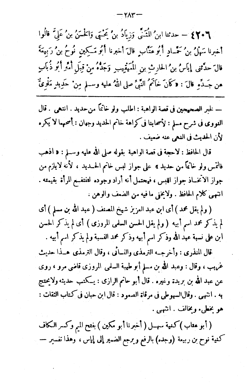 لِخَيْرِ الصَّحِيحَيْنِ فِي قِصَّة الْوَاهِبَة : اُطْلُبْ وَلَوْ خَاتَمًا مِنْ حَدِيد اِنْتَهَى . قَالَ النَّوَوِيّ فِي شَرْح مُسْلِم : لِأَصْحَابِنَا فِي كَرَاهَة خَاتَم الْحَدِيد وَجْهَانِ . أَصَحّهمَا لَا يُكْرَه لِإِنَّ الْحَدِيث فِي النَّهْي عَنْهُ ضَعِيف . قَالَ الْحَافِظ : لَا حُجَّة فِي قِصَّة الْوَاهِبَة بِقَوْلِهِ صَلَّى اللَّه عَلَيْهِ وَسَلَّمَ : " اِذْهَبْ فَالْتَمِسْ وَلَوْ خَاتَمًا مِنْ حَدِيد " عَلَى جَوَاز لُبْس خَاتَم الْحَدِيد ، لِأَنَّهُ لَا يَلْزَم مِنْ جَوَاز الِاتِّخَاذ جَوَاز اللُّبْس ، فَيَحْتَمِل أَنَّهُ أَرَادَ وُجُوده لِتَنْتَفِع الْمَرْأَة بِقِيمَتِهِ . اِنْتَهَى كَلَام الْحَافِظ . وَلَا يَخْفَى مَا فِيهِ مِنْ الضَّعْف وَالْوَهْن .