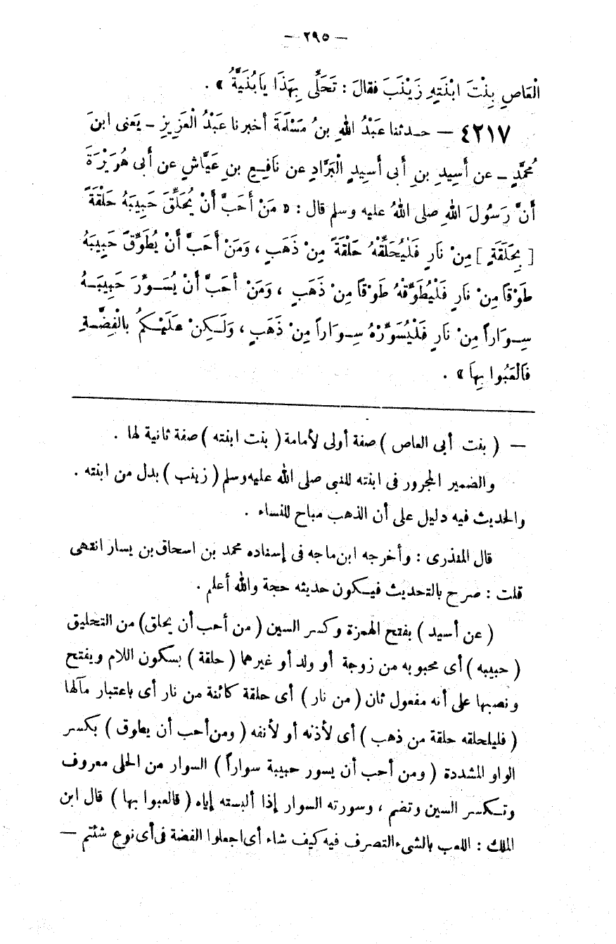 : بَدَل مِنْ اِبْنَته . وَالْحَدِيث فِيهِ دَلِيل عَلَى أَنَّ الذَّهَب مُبَاح لِلنِّسَاءِ .