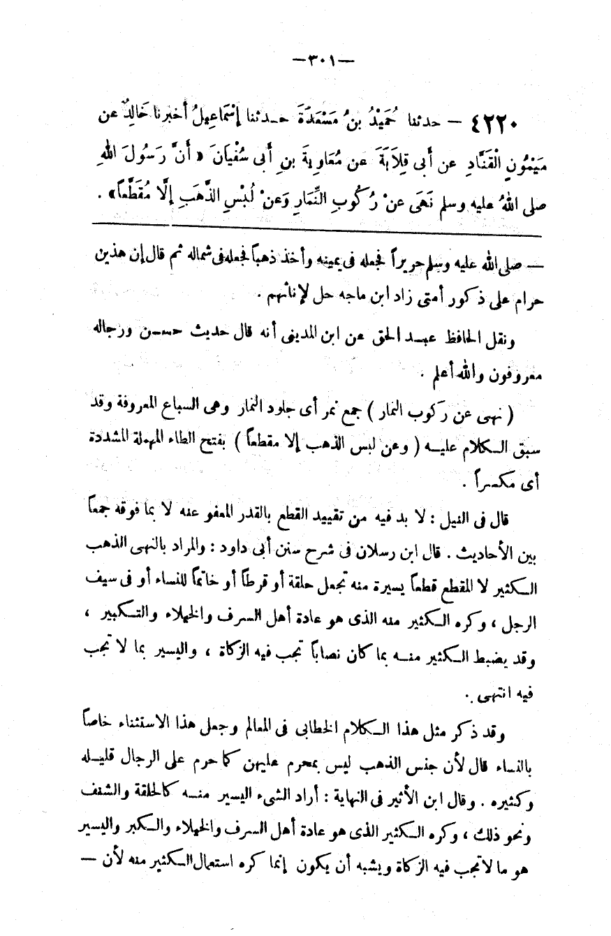 قَالَ فِي النَّيْل : لَا بُدّ فِيهِ مِنْ تَقْيِيد الْقَطْع بِالْقَدْرِ الْمَعْفُوّ عَنْهُ لَا بِمَا فَوْقه جَمْعًا بَيْن الْأَحَادِيث . قَالَ اِبْن رَسْلَان فِي شَرْح سُنَن أَبِي دَاوُدَ : وَالْمُرَاد بِالنَّهْيِ الذَّهَب الْكَثِير لَا الْمُقَطَّع قِطَعًا يَسِيرَة مِنْهُ تُجْعَل حَلْقَة أَوْ قُرْطًا أَوْ خَاتَمًا لِلنِّسَاءِ أَوْ فِي سَيْف الرَّجُل ، وَكَرِهَ الْكَثِير مِنْهُ الَّذِي هُوَ عَادَة أَهْل السَّرَف وَالْخُيَلَاء وَالتَّكْبِير ، وَقَدْ يُضْبَط الْكَثِير مِنْهُ بِمَا كَانَ نِصَابًا تَجِب فِيهِ الزَّكَاة ، وَالْيَسِير بِمَا لَا تَجِب فِيهِ اِنْتَهَى .