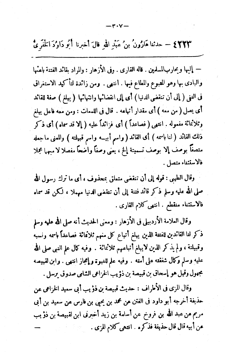 وَقَالَ الْعَلَّامَة الْأَرْدَبِيلِيُّ فِي الْأَزْهَار : وَمَعْنَى الْحَدِيث أَنَّهُ صَلَّى اللَّه عَلَيْهِ وَسَلَّمَ ذَكَرَ لَنَا الْقَائِدَيْنِ لِلْفِتْنَةِ الَّذِينَ يَبْلُغ أَتْبَاع كُلّ مِنْهُمْ ثَلَاثمِائَةٍ فَصَاعِدًا بِاسْمِهِ وَنَسَبه وَقَبِيلَته ، وَلَمْ يَذْكُر الَّذِينَ لَا يَبْلُغ أَتْبَاعهمْ ثَلَاثمِائَةٍ . وَفِيهِ كَمَال عِلْم النَّبِيّ وَكَمَال شَفَقَته عَلَى أُمَّته . وَفِيهِ عَلَمٌ لِلنُّبُوَّةِ وَإِعْجَاز اِنْتَهَى . وَابْنٌ لِقَبِيصَةَ مَجْهُول وَقِيلَ هُوَ إِسْحَاق بْن قَبِيصَة بْن ذُؤَيْب الْخُزَاعِيّ الشَّامِيّ صَدُوق يُرْسِل .