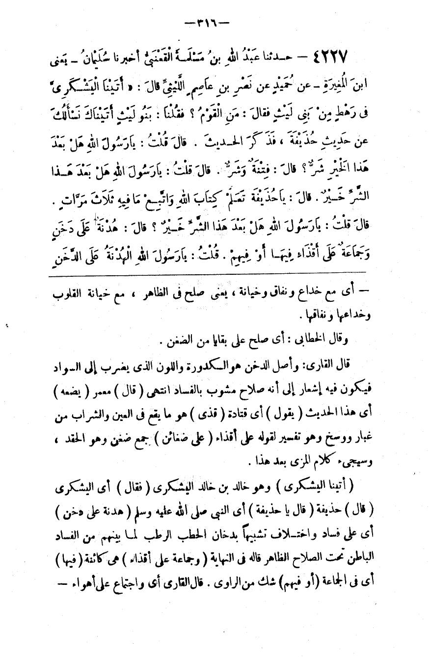 قَالَ الْقَارِي : وَأَصْل الدَّخَن هُوَ الْكُدُورَة وَاللَّوْن الَّذِي يَضْرِب إِلَى السَّوَاد فَيَكُون فِيهِ إِشْعَار إِلَى أَنَّهُ صَلَاح مَشُوب بِالْفَسَادِ اِنْتَهَى .