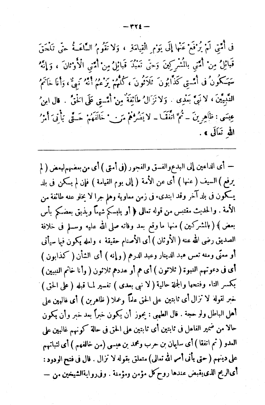 : فَإِنْ لَمْ يَكُنْ فِي بَلَد يَكُون فِي بَلَد آخَر وَقَدْ اُبْتُدِئَ فِي زَمَن مُعَاوِيَة وَهَلُمَّ جَرًّا لَا يَخْلُو عَنْهُ طَائِفَة مِنْ الْأُمَّة . وَالْحَدِيث مُقْتَبَس مِنْ قَوْله تَعَالَى : { أَوْ يَلْبِسَكُمْ شِيَعًا وَيُذِيقَ بَعْضَكُمْ بَأْسَ بَعْضٍ }