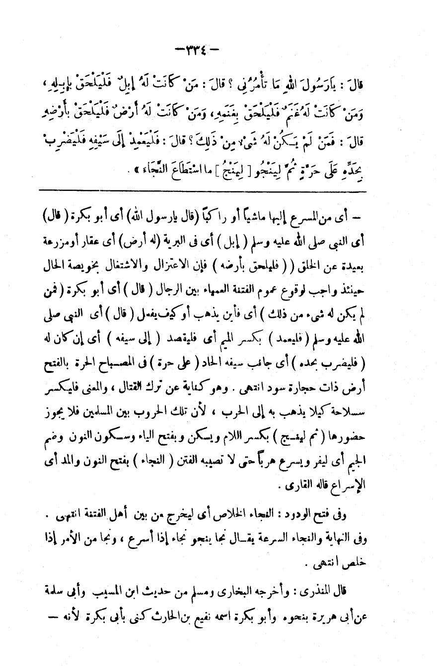 وَفِي فَتْح الْوَدُود : النَّجَاء الْخَلَاص أَيْ لِيَخْرُج مِنْ بَيْن أَهْل الْفِتْنَة اِنْتَهَى . وَفِي النِّهَايَة وَالنَّجَاء السُّرْعَة يُقَال نَجَا يَنْجُو نَجَاء إِذَا أَسْرَعَ ، وَنَجَا مِنْ الْأَمْر إِذَا خَلَصَ اِنْتَهَى .