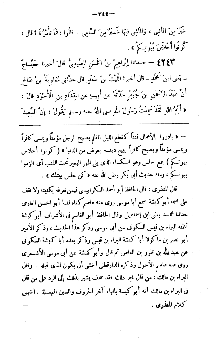 قَالَ الْمُنْذِرِيُّ : قَالَ الْحَافِظ أَبُو أَحْمَد الْكَرَابِيسِيّ فِيمَنْ نَعْرِفهُ بِكُنْيَتِهِ وَلَا نَقِف عَلَى اِسْمه أَبُو كَبْشَة سَمِعَ أَبَا مُوسَى رَوَى عَنْهُ عَاصِم كَنَّاهُ لَنَا أَبُو الْحَسَن الْعَارِمِيّ حَدَّثَنَا مُحَمَّد يَعْنِي اِبْن إِسْمَاعِيل وَقَالَ الْحَافِظ أَبُو الْقَاسِم فِي الْأَشْرَاف أَبُو كَبْشَة أَظُنّهُ الْبَرَاء بْن قَيْس السَّكُونِيّ عَنْ أَبِي مُوسَى وَذَكَرَ هَذَا الْحَدِيث ، وَذَكَرَ الْأَمِير أَبُو نَصْر بْن مَاكُولَا أَبَا كَبْشَة الْبَرَاء بْن قَيْس وَذَكَرَ بَعْده أَبَا كَبْشَة السَّكُونِيّ عَنْ عَبْد اللَّه بْن عَمْرو بْن الْعَاصِ ثُمَّ قَالَ وَأَبُو كَبْشَة عَنْ أَبِي مُوسَى الْأَشْعَرِيّ رَوَى عَنْهُ عَاصِم الْأَحْوَل وَذَكَرَهُ الدَّارَقُطْنِيُّ أَخْشَى أَنْ يَكُون الَّذِي قَبْله . وَقَالَ الْبَرَاء بْن مَالِك : مَنْ قَالَ غَيْر ذَلِكَ فَقَدْ صَحَّفَ يُشِير بِذَلِكَ إِلَى الرَّدّ عَلَى مَنْ قَالَ فِي الْبَرَاء بْن مَالِك أَنَّهُ أَبُو كَيْسَة بِالْيَاءِ آخِر الْحُرُوف وَالسِّين الْمُهْمَلَة . اِنْتَهَى كَلَام الْمُنْذِرِيِّ .@