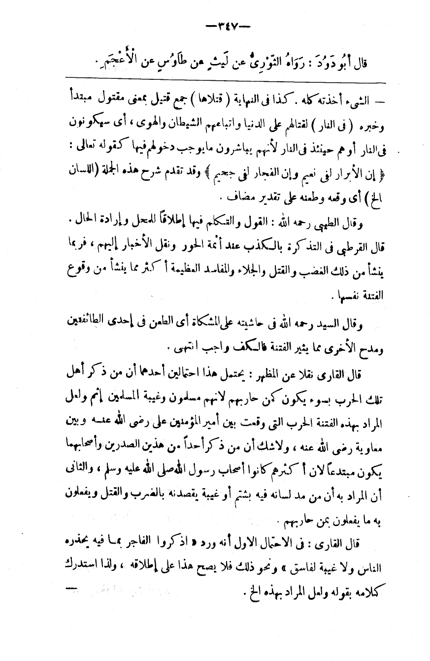 وَقَالَ السَّيِّد رَحِمَهُ اللَّه فِي حَاشِيَته عَلَى الْمِشْكَاة أَيْ الطَّعْن فِي إِحْدَى الطَّائِفَتَيْنِ وَمَدْح الْأُخْرَى مِمَّا يُثِير الْفِتْنَة فَالْكَفّ وَاجِب اِنْتَهَى .