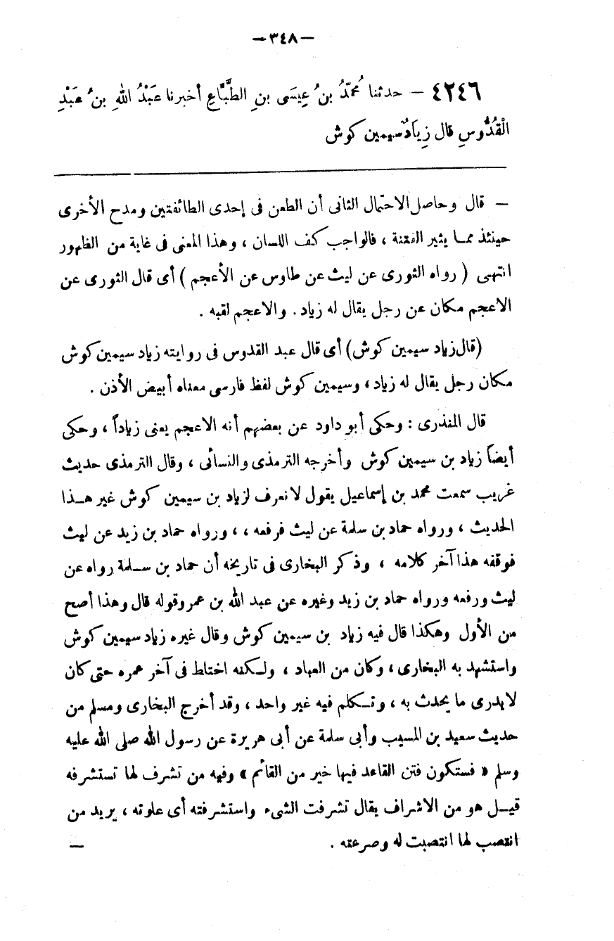 قَالَ الْمُنْذِرِيُّ : وَحَكَى أَبُو دَاوُدَ عَنْ بَعْضهمْ أَنَّهُ الْأَعْجَم يَعْنِي زِيَادًا ، وَحَكَى أَيْضًا زِيَاد بْن سَيَمِينُ كوش وَأَخْرَجَهُ التِّرْمِذِيّ وَالنَّسَائِيُّ ، وَقَالَ التِّرْمِذِيّ حَدِيث غَرِيب سَمِعْت مُحَمَّد بْن إِسْمَاعِيل يَقُول لَا نَعْرِف لِزِيَادِ بْن سيمين كوش غَيْر هَذَا الْحَدِيث ، وَرَوَاهُ حَمَّاد بْن سَلَمَة عَنْ لَيْث فَرَفَعَهُ ، وَرَوَاهُ حَمَّاد بْن زَيْد عَنْ لَيْث فَوَقَفَهُ هَذَا آخِر كَلَامه ، وَذَكَرَ الْبُخَارِيّ فِي تَارِيخه أَنَّ حَمَّاد بْن سَلَمَة رَوَاهُ عَنْ لَيْث وَرَفَعَهُ وَرَوَاهُ حَمَّاد بْن زَيْد وَغَيْره عَنْ عَبْد اللَّه بْن عُمَر وَقَوْله قَالَ وَهَذَا أَصَحّ مِنْ الْأَوَّل وَهَكَذَا قَالَ فِيهِ زِيَاد بْن سيمين كوش وَقَالَ غَيْره زِيَاد سيمين كوش وَاسْتَشْهَدَ بِهِ الْبُخَارِيّ ، وَكَانَ مِنْ الْعُبَّاد ، وَلَكِنَّهُ اِخْتَلَطَ فِي آخِر عُمْره حَتَّى كَانَ لَا يَدْرِي مَا يُحَدِّث بِهِ ، وَتَكَلَّمَ فِيهِ غَيْر وَاحِد ، وَقَدْ أَخْرَجَ الْبُخَارِيّ وَمُسْلِم مِنْ حَدِيث سَعِيد بْن الْمُسَيِّب وَأَبِي سَلَمَة عَنْ أَبِي هُرَيْرَة عَنْ رَسُول اللَّه صَلَّى اللَّه عَلَيْهِ وَسَلَّمَ " فَسَتَكُونُ فِتَن الْقَاعِد فِيهَا خَيْر مِنْ الْقَائِم " وَفِيهِ مَنْ تَشَرَّفَ لَهَا تَسْتَشْرِفهُ قِيلَ هُوَ مِنْ الْإِشْرَاف يُقَال تَشَرَّفْت الشَّيْء وَاسْتَشْرَفْته أَيْ عَلَوْته ، يُرِيد مَنْ اِنْتَصَبَ لَهَا اِنْتَصَبَتْ لَهُ وَصَرَعَتْهُ .@