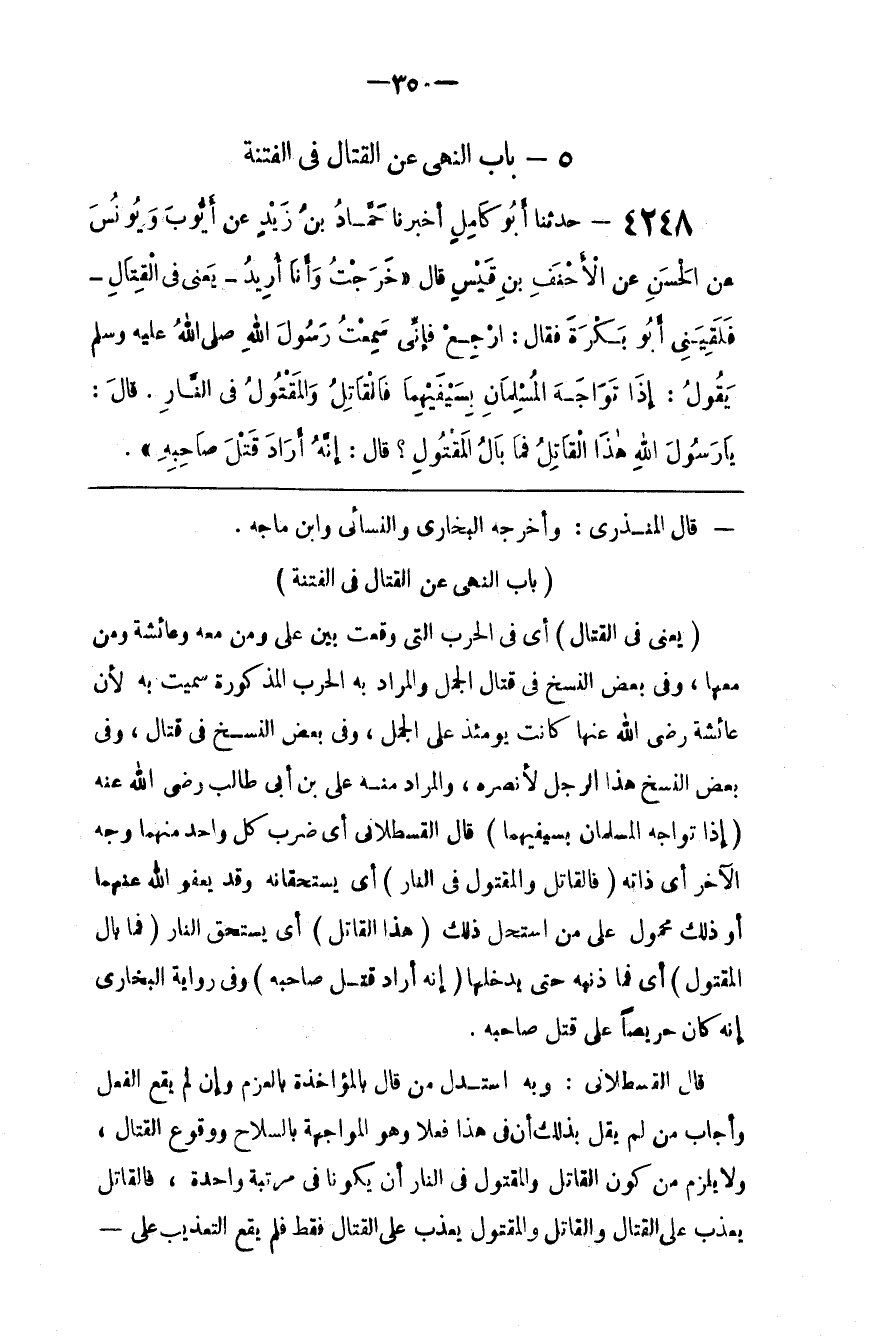قَالَ الْقَسْطَلَّانِيُّ : وَبِهِ اِسْتَدَلَّ مَنْ قَالَ بِالْمُؤَاخَذَةِ بِالْعَزْمِ وَإِنْ لَمْ يَقَع الْفِعْل وَأَجَابَ مَنْ لَمْ يَقُلْ بِذَلِكَ أَنَّ فِي هَذَا فِعْلًا وَهُوَ الْمُوَاجَهَة بِالسِّلَاحِ وَوُقُوع الْقِتَال ، وَلَا يَلْزَم مِنْ كَوْن الْقَاتِل وَالْمَقْتُول فِي النَّار أَنْ يَكُونَا فِي مَرْتَبَة وَاحِدَة ، فَالْقَاتِل يُعَذَّب عَلَى الْقِتَال وَالْقَاتِل وَالْمَقْتُولُ يُعَذَّب عَلَى الْقِتَال فَقَطْ فَلَمْ يَقَع التَّعْذِيب عَلَى @
