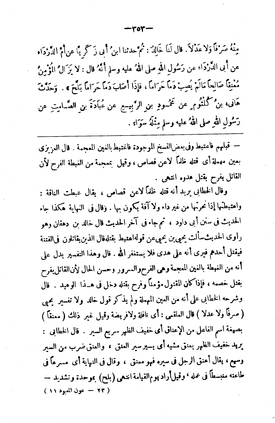 وَقَالَ الْخَطَّابِيُّ : يُرِيد أَنَّهُ قَتَلَهُ ظُلْمًا لَا عَنْ قِصَاص ، يُقَال عَبَطْت النَّاقَة : وَاعْتَبَطْتهَا إِذَا نَحَرْتهَا مِنْ غَيْر دَاء وَلَا آفَة يَكُون بِهَا . وَقَالَ فِي النِّهَايَة هَكَذَا جَاءَ الْحَدِيث فِي سُنَن أَبِي دَاوُدَ ، ثُمَّ جَاءَ فِي آخِر الْحَدِيث قَالَ خَالِد بْن دِهْقَان وَهُوَ رَاوِي الْحَدِيث : سَأَلْت يَحْيَى بْن يَحْيَى عَنْ قَوْله اِعْتَبَطَ بِقَتْلِهِ قَالَ الَّذِينَ يُقَاتِلُونَ فِي الْفِتْنَة فَيَقْتُل أَحَدهمْ فَيَرَى أَنَّهُ عَلَى هُدًى فَلَا يَسْتَغْفِر اللَّه . قَالَ وَهَذَا التَّفْسِير يَدُلّ عَلَى أَنَّهُ مِنْ الْغِبْطَة بَالِغَيْنِ الْمُعْجَمَة وَهِيَ الْفَرَح وَالسُّرُور وَحُسْن الْحَال لِأَنَّ الْقَاتِل يَفْرَح بِقَتْلِ خَصْمه ، فَإِذَا كَانَ الْمَقْتُول مُؤْمِنًا وَفَرِحَ بِقَتْلِهِ دَخَلَ فِي هَذَا الْوَعِيد . قَالَ وَشَرَحَهُ الْخَطَّابِيُّ عَلَى أَنَّهُ مِنْ الْعَيْن الْمُهْمَلَة وَلَمْ يَذْكُر قَوْل خَالِد وَلَا تَفْسِير يَحْيَى
