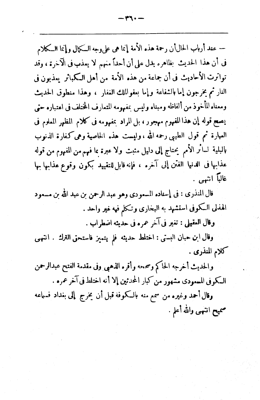 قَالَ الْمُنْذِرِيُّ : فِي إِسْنَاده الْمَسْعُودِيّ وَهُوَ عَبْد الرَّحْمَن بْن عَبْد اللَّه بْن مَسْعُود الْهُذَلِيّ الْكُوفِيّ اِسْتَشْهَدَ بِهِ الْبُخَارِيّ وَتَكَلَّمَ فِيهِ غَيْر وَاحِد .