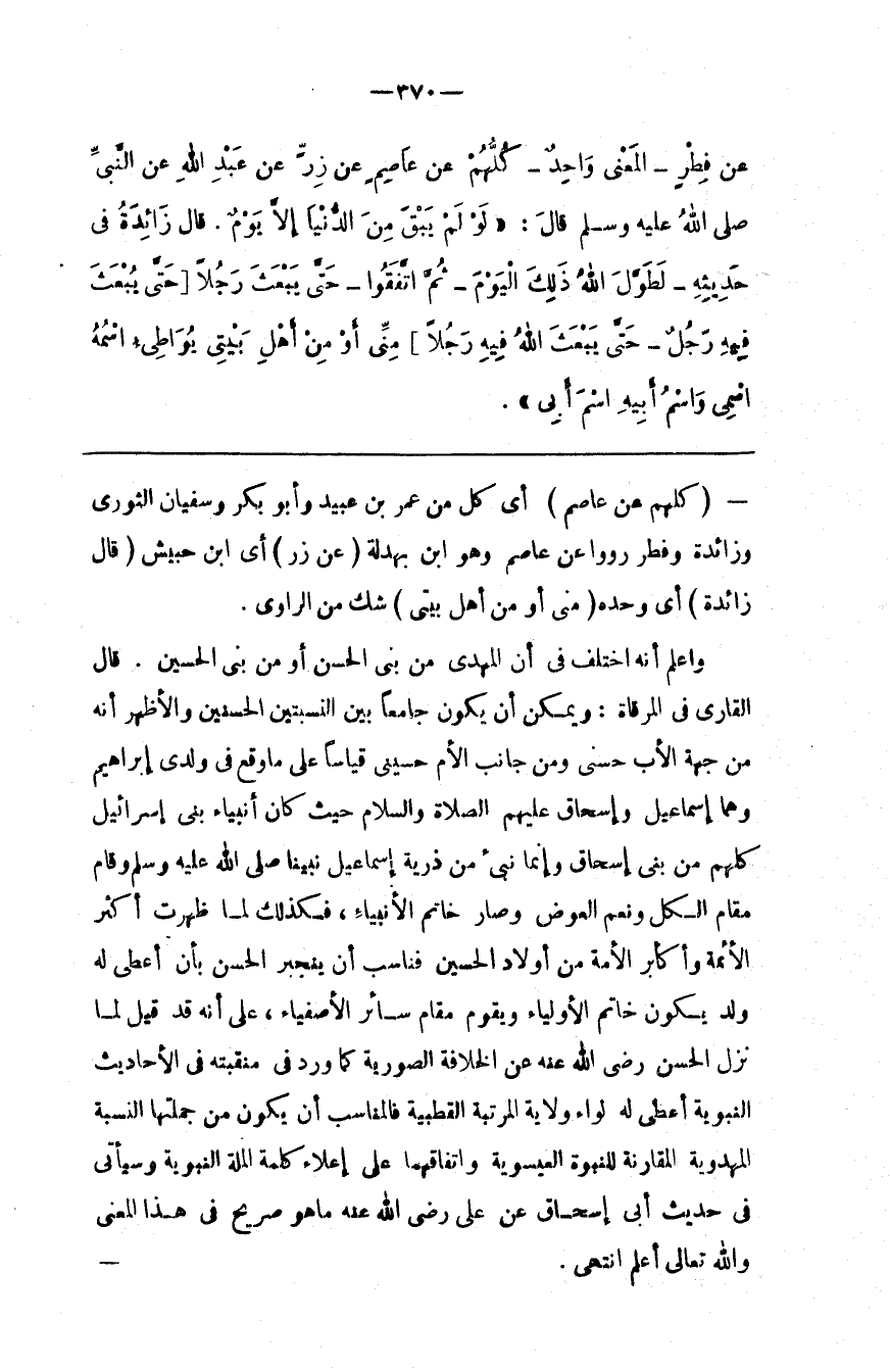 وَاعْلَمْ أَنَّهُ اُخْتُلِفَ فِي أَنَّ الْمَهْدِيّ مِنْ بَنِي الْحَسَن أَوْ مِنْ بَنِي الْحُسَيْن . قَالَ الْقَارِي فِي الْمِرْقَاة : وَيُمْكِن أَنْ يَكُون جَامِعًا بَيْن النِّسْبَتَيْنِ الْحَسَنَيْنِ وَالْأَظْهَر أَنَّهُ مِنْ جِهَة الْأَب حَسَنِيّ وَمِنْ جَانِب الْأُمّ حُسَيْنِيّ قِيَاسًا عَلَى مَا وَقَعَ فِي وَلَدَيْ إِبْرَاهِيم وَهُمَا إِسْمَاعِيل وَإِسْحَاق عَلَيْهِمْ الصَّلَاة وَالسَّلَام حَيْثُ كَانَ أَنْبِيَاء بَنِي إِسْرَائِيل كُلّهمْ مِنْ بَنِي إِسْحَاق وَإِنَّمَا نُبِّئَ مِنْ ذُرِّيَّة إِسْمَاعِيل نَبِيّنَا صَلَّى اللَّه عَلَيْهِ وَسَلَّمَ وَقَامَ مَقَام الْكُلّ وَنِعْمَ الْعِوَض وَصَارَ خَاتَم الْأَنْبِيَاء ، فَكَذَلِكَ لَمَّا ظَهَرَتْ أَكْثَر الْأَئِمَّة وَأَكَابِر الْأُمَّة مِنْ أَوْلَاد الْحُسَيْن فَنَاسَبَ أَنْ يَنْجَبِر الْحَسَن بِأَنْ أُعْطِيَ لَهُ وَلَد يَكُون خَاتَم الْأَوْلِيَاء وَيَقُوم مَقَام سَائِر الْأَصْفِيَاء ، عَلَى أَنَّهُ قَدْ قِيلَ لَمَّا نَزَلَ الْحَسَن رَضِيَ اللَّه عَنْهُ عَنْ الْخِلَافَة الصُّورِيَّة كَمَا وَرَدَ فِي مَنْقَبَته فِي الْأَحَادِيث النَّبَوِيَّة أُعْطِيَ لَهُ لِوَاء وِلَايَة الْمَرْتَبَة الْقُطْبِيَّة فَالْمُنَاسِب أَنْ يَكُون مِنْ جُمْلَتهَا النِّسْبَة الْمَهْدَوِيَّة الْمُقَارِنَة لِلنُّبُوَّةِ الْعِيسَوِيَّة وَاتِّفَاقهمَا عَلَى إِعْلَاء كَلِمَة الْمِلَّة النَّبَوِيَّة وَسَيَأْتِي فِي حَدِيث أَبِي إِسْحَاق عَنْ عَلِيّ رَضِيَ اللَّه عَنْهُ مَا هُوَ صَرِيح فِي هَذَا الْمَعْنَى وَاَللَّه تَعَالَى أَعْلَم اِنْتَهَى .@