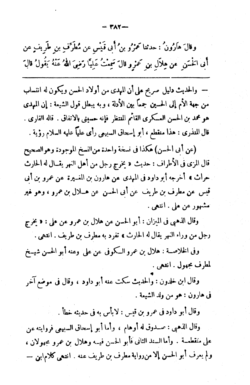 وَقَالَ الذَّهَبِيّ : صَدُوق لَهُ أَوْهَام ، وَأَمَّا أَبُو إِسْحَاق السُّبَيْعِيُّ فَرِوَايَته عَنْ عَلِيّ مُنْقَطِعَة . وَأَمَّا السَّنَد الثَّانِي فَأَبُو الْحَسَن فِيهِ وَهِلَال بْن عَمْرو مَجْهُولَانِ ، وَلَمْ يُعْرَف أَبُو الْحَسَن إِلَّا مِنْ رِوَايَة مُطَرِّف بْن طَرِيف عَنْهُ . اِنْتَهَى كَلَام@