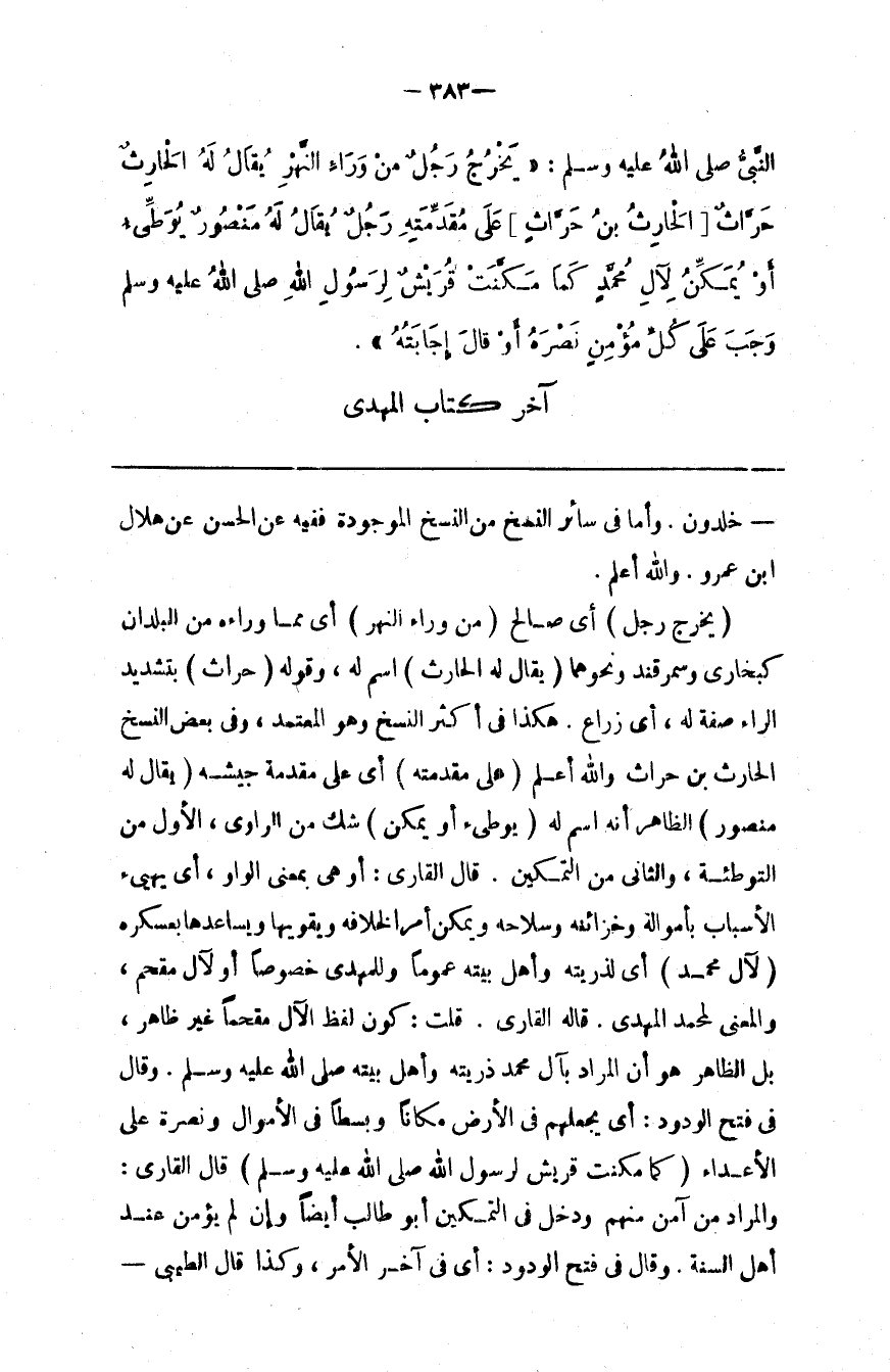 : أَيْ لِذُرِّيَّتِهِ وَأَهْل بَيْته عُمُومًا وَلِلْمَهْدِيِّ خُصُوصًا أَوْ لِآلِ مُقْحَم ، وَالْمَعْنَى لِمُحَمَّدٍ الْمَهْدِيّ . قَالَهُ الْقَارِي . قُلْت : كَوْن لَفْظ الْآل مُقْحَمًا غَيْر ظَاهِر ، بَلْ الظَّاهِر هُوَ أَنَّ الْمُرَاد بِآلِ مُحَمَّد ذُرِّيَّته وَأَهْل بَيْته صَلَّى اللَّه عَلَيْهِ وَسَلَّمَ . وَقَالَ فِي فَتْح الْوَدُود : أَيْ يَجْعَلهُمْ فِي الْأَرْض مَكَانًا وَبَسْطًا فِي الْأَمْوَال وَنُصْرَة عَلَى الْأَعْدَاء