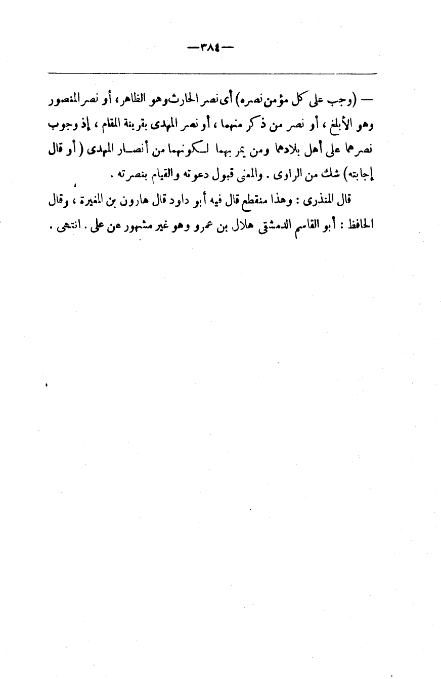 : أَيْ نَصْر الْحَارِث وَهُوَ الظَّاهِر ، أَوْ نَصْر الْمَنْصُور وَهُوَ الْأَبْلَغ ، أَوْ نَصْر مَنْ ذُكِرَ مِنْهُمَا ، أَوْ نَصْر الْمَهْدِيّ بِقَرِينِهِ الْمَقَام ، إِذْ وُجُوب نَصْرهمَا عَلَى أَهْل بِلَادهمَا وَمَنْ يَمُرّ بِهِمَا لِكَوْنِهِمَا مِنْ أَنْصَار الْمَهْدِيّ