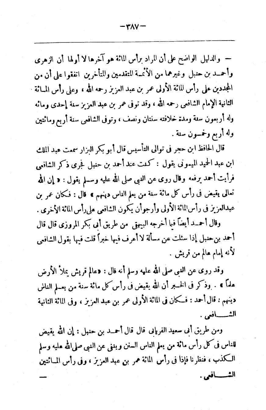 قَالَ الْحَافِظ اِبْن حَجَر فِي تَوَالِي التَّأْسِيس قَالَ أَبُو بَكْر الْبَزَّار : سَمِعْت عَبْد الْمَلِك بْنَ عَبْد الْحَمِيد الْمَيْمُونِيّ يَقُول : كُنْت عِنْد أَحْمَد بْن حَنْبَل فَجَرَى ذِكْر الشَّافِعِيّ فَرَأَيْت أَحْمَد يَرْفَعهُ وَقَالَ رُوِيَ عَنْ النَّبِيّ صَلَّى اللَّه عَلَيْهِ وَسَلَّمَ يَقُول : " إِنَّ اللَّه تَعَالَى يُقَيِّض فِي رَأْس كُلّ مِائَة سَنَة مَنْ يُعَلِّم النَّاس دِينهمْ " قَالَ : فَكَانَ عُمَر بْن عَبْد الْعَزِيز فِي رَأْس الْمِائَة الْأُولَى وَأَرْجُو أَنْ يَكُون الشَّافِعِيّ عَلَى رَأْس الْمِائَة الْأُخْرَى .