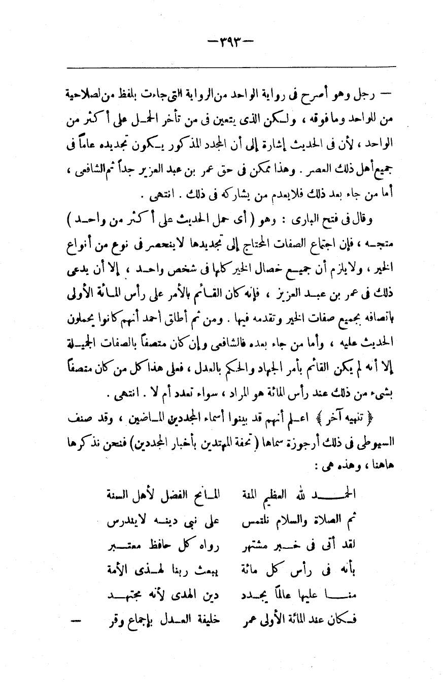 تَنْبِيه آخَر : اِعْلَمْ أَنَّهُمْ قَدْ بَيَّنُوا أَسْمَاء الْمُجَدِّدِينَ الْمَاضِينَ ، وَقَدْ صَنَّفَ السُّيُوطِيُّ فِي ذَلِكَ أُرْجُوزَة سَمَّاهَا ( تُحْفَة الْمُهْتَدِينَ بِأَخْبَارِ الْمُجَدِّدِينَ ) : فَنَحْنُ نَذْكُرهَا هَا هُنَا ، وَهَذِهِ هِيَ : الْحَمْد لِلَّهِ الْعَظِيم الْمِنَّة الْمَانِح الْفَضْل لِأَهْلِ السُّنَّة ثُمَّ الصَّلَاة وَالسَّلَام نَلْتَمِس عَلَى نَبِيّ دِينه لَا يَنْدَرِس لَقَدْ أَتَى فِي خَبَر مُشْتَهِر رَوَاهُ كُلّ حَافِظ مُعْتَبِر بِأَنَّهُ فِي رَأْس كُلّ مِائَة يَبْعَث رَبّنَا لِهَذِي الْأُمَّة مَنًّا عَلَيْهَا عَالِمًا يُجَدِّد دِين الْهُدَى لِأَنَّهُ مُجْتَهِد فَكَانَ عِنْد الْمِائَة الْأُولَى عُمَر خَلِيفَة الْعَدْل بِإِجْمَاعِ وَقَر@