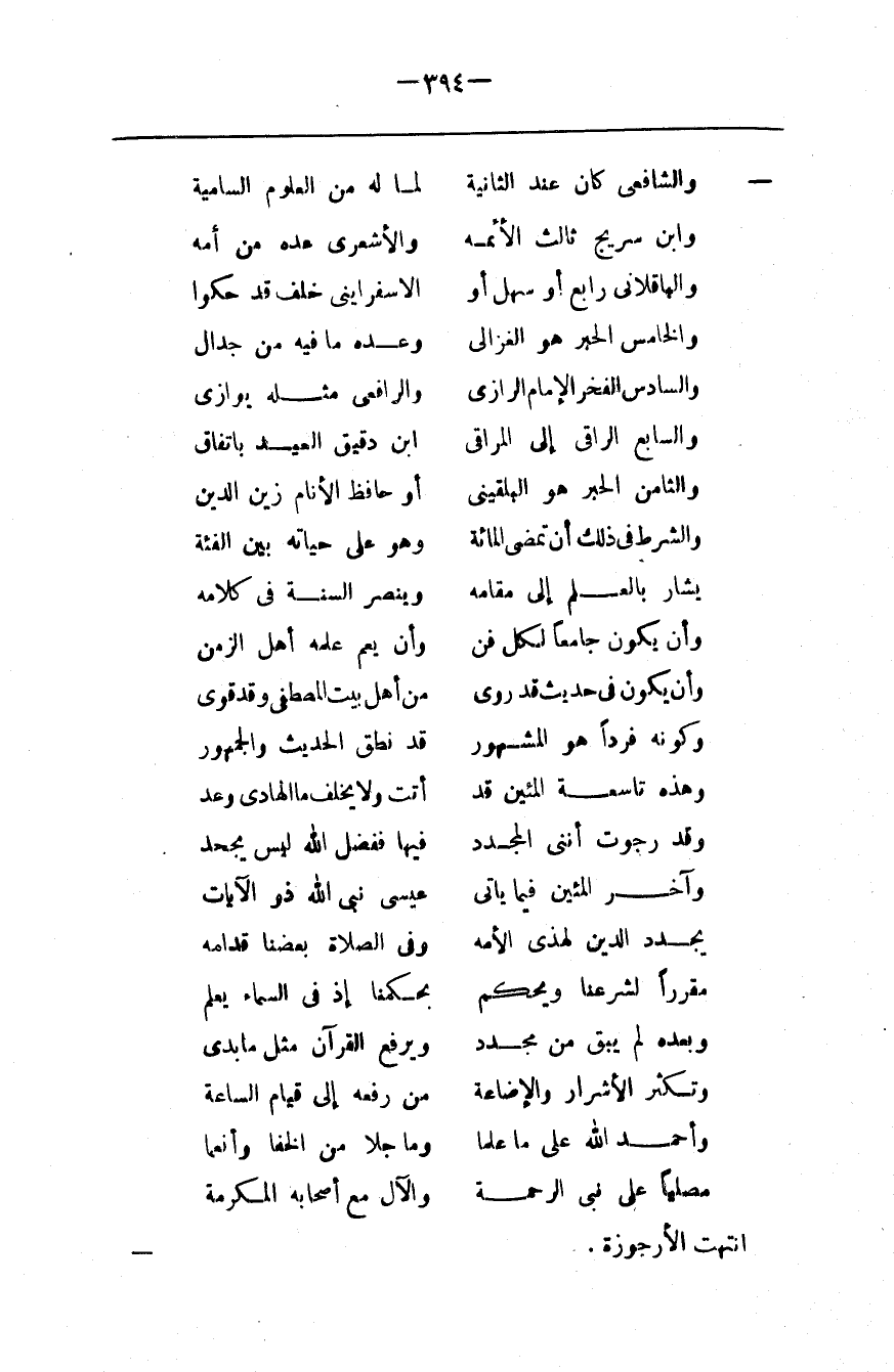 وَالشَّافِعِيّ كَانَ عِنْد الثَّانِيَة لِمَا لَهُ مِنْ الْعُلُوم السَّامِيَة وَابْن سُرَيْج ثَالِث الْأَئِمَّة وَالْأَشْعَرِيّ عَدَّهُ مَنْ أَمَّهْ وَالْبَاقِلَانِي رَابِع أَوْ سَهْل أَوْ الْإِسْفَرَايِينِي خَلَف قَدْ حَكَوْا وَالْخَامِس الْحَبْر هُوَ الْغَزَالِي وَعَدَّهُ مَا فِيهِ مِنْ جِدَال وَالسَّادِس الْفَخْر الْإِمَام الرَّازِي وَالرَّافِعِي مِثْله يُوَازِي وَالسَّابِع الرَّاقِي إِلَى الْمَرَاقِي اِبْن دَقِيق الْعِيد بِاتِّفَاقِ وَالثَّامِن الْحَبْر هُوَ الْبُلْقِينِي أَوْ حَافِظ الْأَنَام زَيْن الدِّين وَالشَّرْط فِي ذَلِكَ أَنْ تَمْضِي الْمِائَة وَهُوَ عَلَى حَيَاته بَيْن الْفِئَة يُشَار بِالْعِلْمِ إِلَى مَقَامه وَيَنْصُر السُّنَّة فِي كَلَامه وَأَنْ يَكُون جَامِعًا لِكُلِّ فَنّ وَأَنْ يَعُمّ عِلْمه أَهْل الزَّمَن وَأَنْ يَكُون فِي حَدِيث قَدْ رُوِي مِنْ أَهْل بَيْت الْمُصْطَفَى وَقَدْ قَوِي وَكَوْنه فَرْدًا هُوَ الْمَشْهُور قَدْ نَطَقَ الْحَدِيث وَالْجُمْهُور وَهَذِهِ تَاسِعَة الْمِئِين قَدْ أَتَتْ وَلَا يُخْلَف مَا الْهَادِي وَعَدَ وَقَدْ رَجَوْت أَنَّنِي الْمُجَدِّد فِيهَا فَفَضْل اللَّه لَيْسَ يُجْحَد وَآخِر الْمِئِين فِيمَا يَاتِي عِيسَى نَبِيّ اللَّه ذُو الْآيَات يُجَدِّد الدِّين لِهَذِي الْأُمَّة وَفِي الصَّلَاة بَعْضنَا قَدْ أَمَّهْ مُقَرِّرًا لِشَرْعِنَا وَيْحكُمْ بِحُكْمِنَا إِذْ فِي السَّمَاء يَعْلَم وَبَعْده لَمْ يَبْقَ مِنْ مُجَدِّد وَيُرْفَع الْقُرْآن مِثْل مَا بُدِي وَتَكْثُر الْأَشْرَار وَالْإِضَاعَة مِنْ رَفْعه إِلَى قِيَام السَّاعَة وَأَحْمَد اللَّه عَلَى مَا عَلَّمَا وَمَا جَلَا مِنْ اِلْخَفَا وَأَنْعَمَا مُصَلِّيًا عَلَى نَبِيّ الرَّحْمَة وَالْآل مَعْ أَصْحَابه الْمَكْرُمَة اِنْتَهَتْ الْأُرْجُوزَة .@