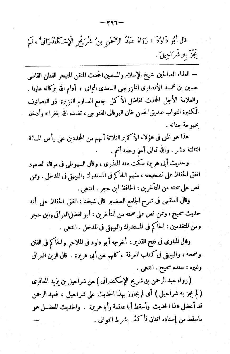 الْعُلَمَاء الصَّالِحِينَ شَيْخ الْإِسْلَام وَالْمُسْلِمِينَ الْمُحَدِّث الْمُتْقِن الْمُتَبَحِّر الْفَطِن الْقَاضِي حُسَيْن بْن مُحَمَّد الْأَنْصَارِيّ الْخَزْرَجِيّ السَّعْدِيّ الْيَمَانِيّ ، أَدَامَ اللَّه بَرَكَاته عَلَيْنَا . وَالْعَلَّامَة الْأَجَلّ الْمُحَدِّث الْفَاضِل الْأَكْمَل جَامِع الْعُلُوم الْغَزِيرَة ذُو التَّصَانِيف الْكَثِيرَة النَّوَّاب صَدِيق الْحَسَن خَان الْبُوفَالِي الْقَنُّوجِيّ ، تَغَمَّدَهُ اللَّه بِغُفْرَانِهِ وَأَدْخَلَهُ بُحْبُوحَة جِنَانه . هَذَا هُوَ ظَنِّي فِي هَؤُلَاءِ الْأَكَابِر الثَّلَاثَة أَنَّهُمْ مِنْ الْمُجَدِّدِينَ عَلَى رَأْس الْمِائَة الثَّالِثَة عَشَر ، وَاَللَّه تَعَالَى أَعْلَم وَعِلْمه أَتَمّ . وَحَدِيث أَبِي هُرَيْرَة سَكَتَ عَنْهُ الْمُنْذِرِيُّ ، وَقَالَ السُّيُوطِيُّ فِي مِرْقَاة الصُّعُود : اِتَّفَقَ الْحُفَّاظ عَلَى تَصْحِيحه ، مِنْهُمْ الْحَاكِم فِي الْمُسْتَدْرَك وَالْبَيْهَقِيُّ فِي الْمَدْخَل . وَمِمَّنْ نَصَّ عَلَى صِحَّته مِنْ الْمُتَأَخِّرِينَ : الْحَافِظ اِبْن حَجَر . اِنْتَهَى . وَقَالَ الْعَلْقَمِيّ فِي شَرْح الْجَامِع الصَّغِير قَالَ شَيْخنَا : اِتَّفَقَ الْحُفَّاظ عَلَى أَنَّهُ حَدِيث صَحِيح . وَمِمَّنْ نَصَّ عَلَى صِحَّته مِنْ الْمُتَأَخِّرِينَ : أَبُو الْفَضْل الْعِرَاقِيّ وَابْن حَجَر وَمِنْ الْمُتَقَدِّمِينَ : الْحَاكِم فِي الْمُسْتَدْرَك وَالْبَيْهَقِيُّ فِي الْمَدْخَل . اِنْتَهَى .