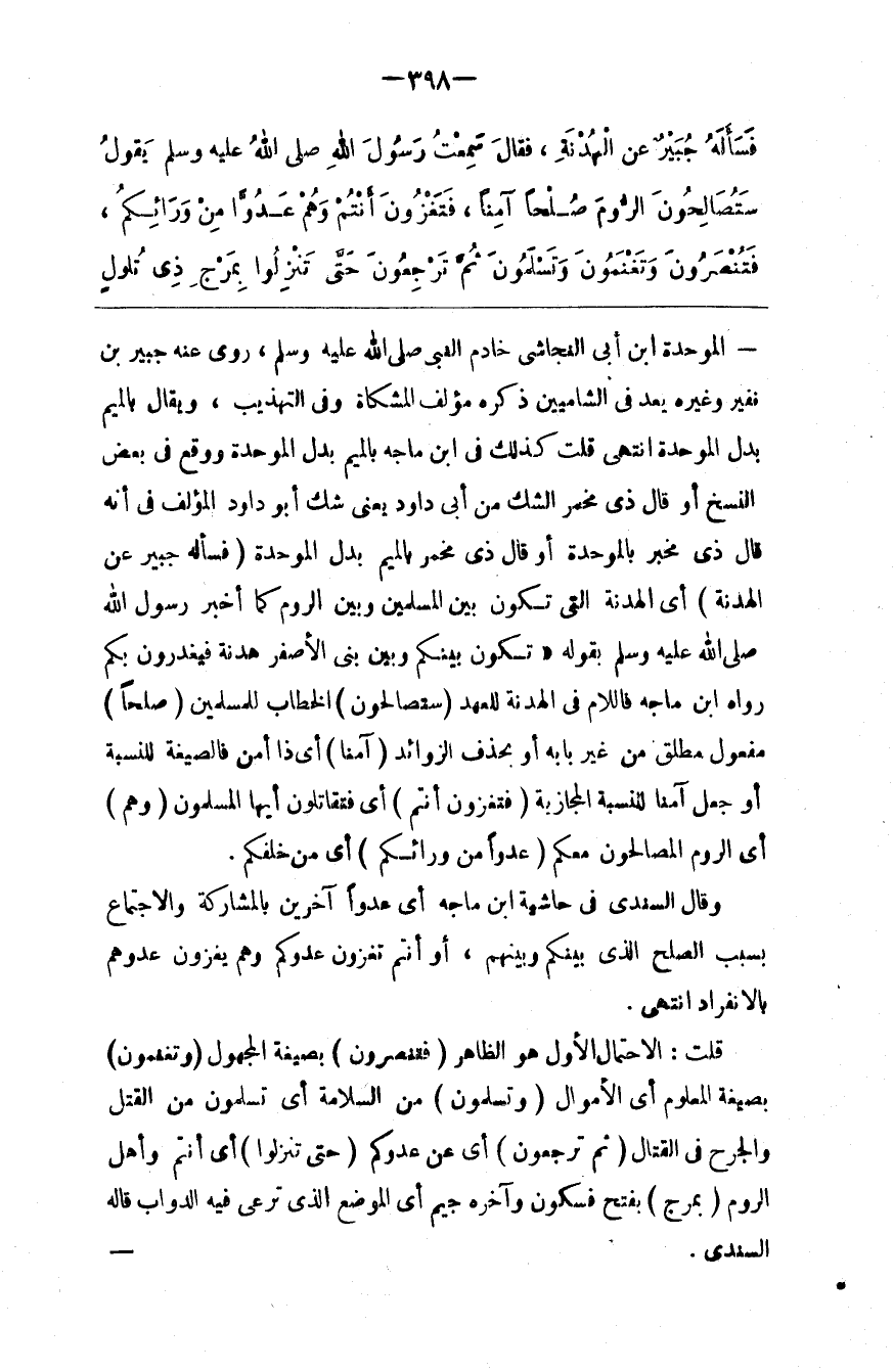 : أَيْ الْهُدْنَة الَّتِي يَكُون بَيْن الْمُسْلِمِينَ وَبَيْن الرُّوم كَمَا أَخْبَرَ رَسُول اللَّه صَلَّى اللَّه عَلَيْهِ وَسَلَّمَ بِقَوْلِهِ : " تَكُون بَيْنكُمْ وَبَيْن بَنِي الْأَصْفَر هُدْنَة فَيَغْدِرُونَ بِكَمْ " رَوَاهُ اِبْن مَاجَهْ فَاللَّام فِي الْهُدْنَة لِلْعَهْدِ أَوْ بِحَذْفِ الزَّوَائِد