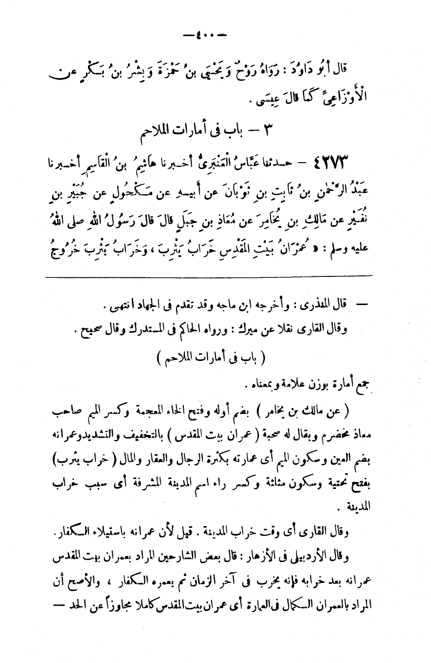 وَقَالَ الْأَرْدَبِيلِيّ فِي الْأَزْهَار : قَالَ بَعْض الشَّارِحِينَ الْمُرَاد بِعُمْرَانِ بَيْت الْمَقْدِس عُمْرَانه بَعْد خَرَابه فَإِنَّهُ يُخَرَّب فِي آخِر الزَّمَان ثُمَّ يُعَمِّرهُ الْكُفَّار ، وَالْأَصَحّ أَنَّ الْمُرَاد بِالْعُمْرَانِ الْكَمَال فِي الْعِمَارَة أَيْ عُمْرَان بَيْت الْمَقْدِس كَامِلًا مُجَاوِزًا عَنْ الْحَدّ @