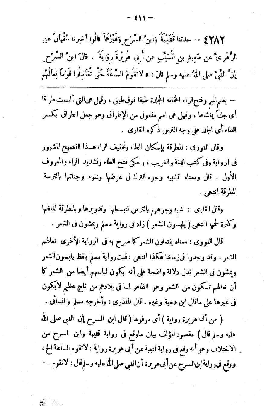وَقَالَ النَّوَوِيّ : الْمُطْرَقَة بِإِسْكَانِ الطَّاء وَتَخْفِيف الرَّاء هَذَا الْفَصِيح الْمَشْهُور فِي الرِّوَايَة وَفِي كُتُب اللُّغَة وَالْغَرِيب ، وَحُكِيَ فَتْح الطَّاء وَتَشْدِيد الرَّاء وَالْمَعْرُوف الْأَوَّل . قَالَ وَمَعْنَاهُ تَشْبِيه وُجُوه التُّرْك فِي عَرْضهَا وَنُتُوء وَجَنَاتهَا بِالتُّرْسَةِ الْمُطْرَقَة اِنْتَهَى .
