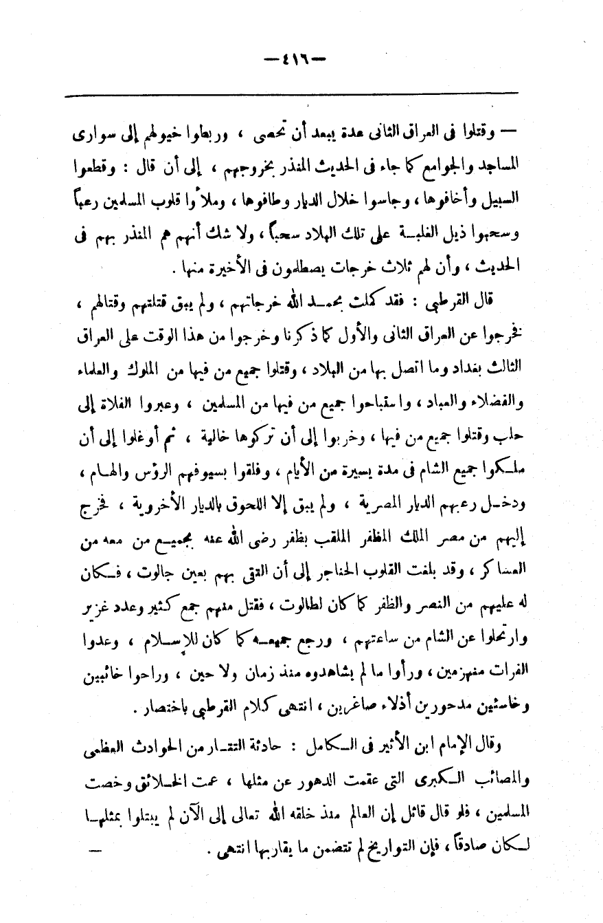 وَقَالَ الْإِمَام اِبْن الْأَثِير فِي الْكَامِل : حَادِثَة التَّتَار مِنْ الْحَوَادِث الْعُظْمَى وَالْمَصَائِب الْكُبْرَى الَّتِي عَقِمَتْ الدُّهُور عَنْ مِثْلهَا ، عَمَّتْ الْخَلَائِق وَخَصَّتْ الْمُسْلِمِينَ ، فَلَوْ قَالَ قَائِل إِنَّ الْعَالَم مُنْذُ خَلَقَهُ اللَّه تَعَالَى إِلَى الْآن لَمْ يُبْتَلَوْا بِمِثْلِهَا لَكَانَ صَادِقًا ، فَإِنَّ التَّوَارِيخ لَمْ تَتَضَمَّن مَا يُقَارِبهَا اِنْتَهَى .@