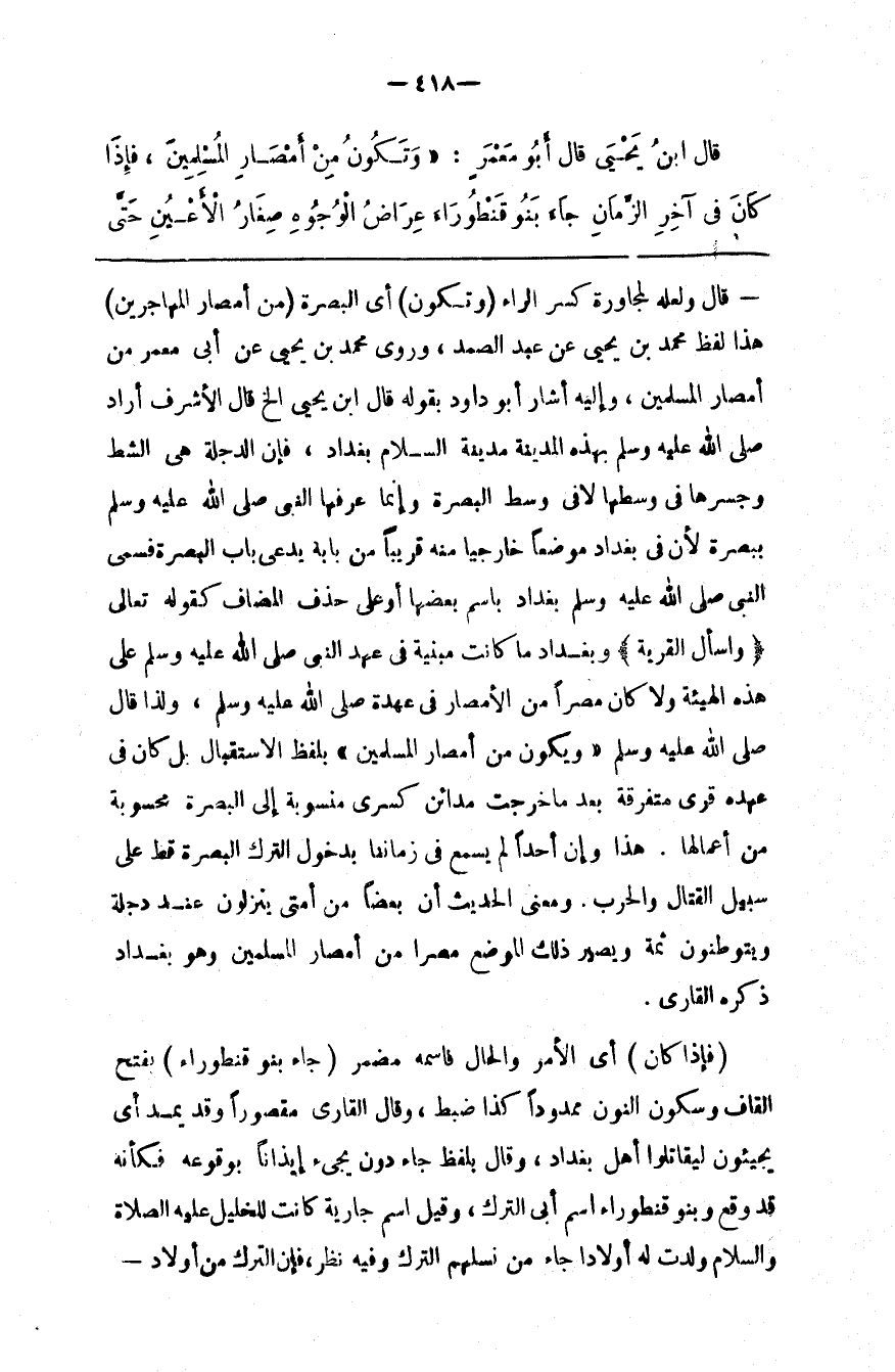 : هَذَا لَفْظ مُحَمَّد بْن يَحْيَى عَنْ عَبْد الصَّمَد ، وَرَوَى مُحَمَّد بْن يَحْيَى عَنْ أَبِي مَعْمَر مِنْ أَمْصَار الْمُسْلِمِينَ ، وَإِلَيْهِ أَشَارَ أَبُو دَاوُدَ بِقَوْلِهِ قَالَ اِبْن يَحْيَى إِلَخْ قَالَ الْأَشْرَف : أَرَادَ صَلَّى اللَّه عَلَيْهِ وَسَلَّمَ بِهَذِهِ الْمَدِينَة السَّلَام بَغْدَاد ، فَإِنَّ الدِّجْلَة هِيَ الشَّطّ وَجِسْرهَا فِي وَسَطهَا لَا فِي وَسَط الْبَصْرَة وَإِنَّمَا عَرَّفَهَا النَّبِيّ صَلَّى اللَّه عَلَيْهِ وَسَلَّمَ بِبَصْرَة لِأَنَّ فِي بَغْدَاد مَوْضِعًا خَارِجِيًّا مِنْهُ قَرِيبًا مِنْ بَابه يُدْعَى بَاب الْبَصْرَة فَسَمَّى النَّبِيّ صَلَّى اللَّه عَلَيْهِ وَسَلَّمَ بَغْدَاد بِاسْمِ بَعْضهَا أَوْ عَلَى حَذْف الْمُضَاف كَقَوْلِهِ تَعَالَى : { وَاسْأَلِ الْقَرْيَةَ } وَبَغْدَاد مَا كَانَتْ مَبْنِيَّة فِي عَهْد النَّبِيّ صَلَّى اللَّه عَلَيْهِ وَسَلَّمَ عَلَى هَذِهِ الْهَيْئَة وَلَا كَانَ مِصْرًا مِنْ الْأَمْصَار فِي عَهْده صَلَّى اللَّه عَلَيْهِ وَسَلَّمَ ، وَلِذَا قَالَ صَلَّى اللَّه عَلَيْهِ وَسَلَّمَ : " وَيَكُون مِنْ أَمْصَار الْمُسْلِمِينَ ، بِلَفْظِ الِاسْتِقْبَال بَلْ كَانَ فِي عَهْده قُرًى مُتَفَرِّقَة بَعْد مَا خَرَجَتْ مَدَائِن كِسْرَى مَنْسُوبَة إِلَى الْبَصْرَة مَحْسُوبَة مِنْ أَعْمَالهَا . هَذَا وَإنَّ أَحَدًا لَمْ يَسْمَع فِي زَمَاننَا بِدُخُولِ التُّرْك الْبَصْرَة قَطُّ عَلَى سَبِيل الْقِتَال وَالْحَرْب . وَمَعْنَى الْحَدِيث أَنَّ بَعْضًا مِنْ أُمَّتِي يَنْزِلُونَ عِنْد دِجْلَة وَيَتَوَطَّنُونَ ثَمَّةَ وَيَصِير ذَلِكَ الْمَوْضِع مِصْرًا مِنْ أَمْصَار الْمُسْلِمِينَ وَهُوَ بَغْدَاد ذَكَرَهُ الْقَارِي .