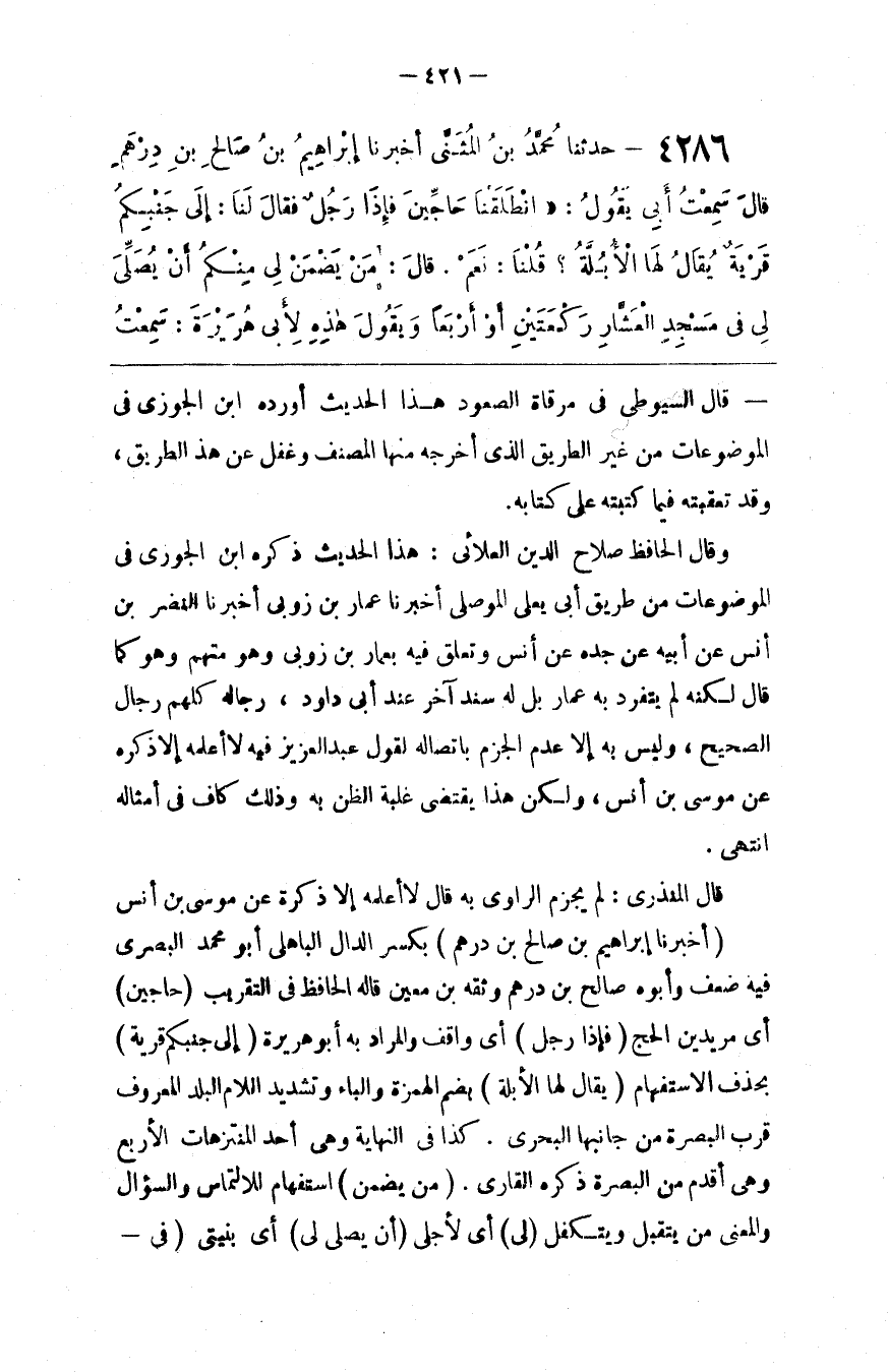 قَالَ السُّيُوطِيّ : فِي مِرْقَاة الصُّعُود هَذَا الْحَدِيث أَوْرَدَهُ اِبْن الْجَوْزِيّ فِي الْمَوْضُوعَات مِنْ غَيْر الطَّرِيق الَّذِي أَخْرَجَهُ مِنْهَا الْمُصَنِّف وَغَفَلَ عَنْ هَذَا الطَّرِيق ، وَقَدْ تَعَقَّبْته فِيمَا كَتَبْته عَلَى كِتَابه . وَقَالَ الْحَافِظ صَلَاح الدِّين الْعَلَائِيّ : هَذَا الْحَدِيث ذَكَرَهُ اِبْن الْجَوْزِيّ فِي الْمَوْضُوعَات مِنْ طَرِيق أَبِي يَعْلَى الْمَوْصِلِيّ أَخْبَرَنَا عَمَّار بْن زوبى أَخْبَرَنَا النَّصْر بْن أَنَس عَنْ أَبِيهِ عَنْ جَدّه عَنْ أَنَس وَيُعَلَّق فِيهِ بِعَمَّارِ بْن زوبى وَهُوَ مُتَّهَم وَهُوَ كَمَا قَالَ لَكِنَّهُ لَمْ يَتَفَرَّد بِهِ عَمَّار بَلْ لَهُ سَنَد آخَر عِنْد أَبِي دَاوُدَ ، رِجَاله كُلّهمْ رِجَال الصَّحِيح ، وَلَيْسَ بِهِ إِلَّا عَدَم الْجَزْم بِاتِّصَالِهِ لِقَوْلِ عَبْد الْعَزِيز فِيهِ لَا أَعْلَمهُ إِلَّا ذَكَرَهُ عَنْ مُوسَى بْن أَنَس ، وَلَكِنَّ هَذَا يَقْتَضِي غَلَبَة الظَّنّ بِهِ وَذَلِكَ كَافٍ فِي أَمْثَاله اِنْتَهَى .