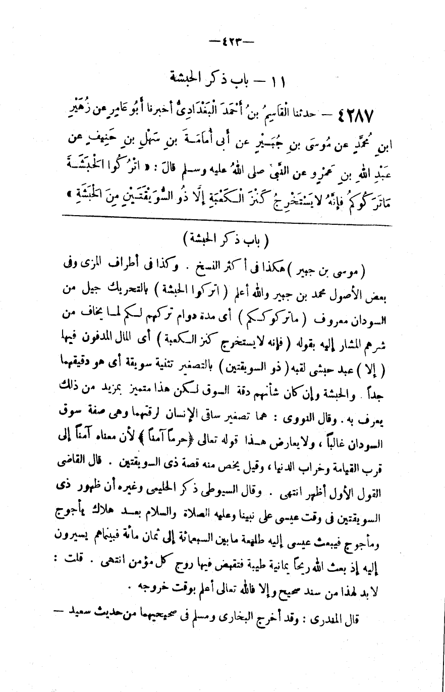 وَقَالَ السُّيُوطِيّ : ذَكَرَ الْحَلِيمِيّ وَغَيْره أَنَّ ظُهُور ذِي السُّوَيْقَتَيْنِ فِي وَقْت عِيسَى عَلَى نَبِيّنَا وَعَلَيْهِ الصَّلَاة وَالسَّلَام بَعْد هَلَاك يَأْجُوج وَمَأْجُوج فَيَبْعَث عِيسَى إِلَيْهِ طَلِيعَة مَا بَيْن السَّبْعمِائَةِ إِلَى ثَمَان مِائَة فَبَيْنَمَا هُمْ يَسِيرُونَ إِلَيْهِ إِذْ بَعَثَ اللَّه رِيحًا يَمَانِيَّة طَيِّبَة فَتُقْبَض فِيهَا رُوح كُلّ مُؤْمِن اِنْتَهَى . قُلْت : لَا بُدّ لِهَذَا مِنْ سَنَد صَحِيح وَإِلَّا فَاَللَّه تَعَالَى أَعْلَم بِوَقْتِ خُرُوجه .